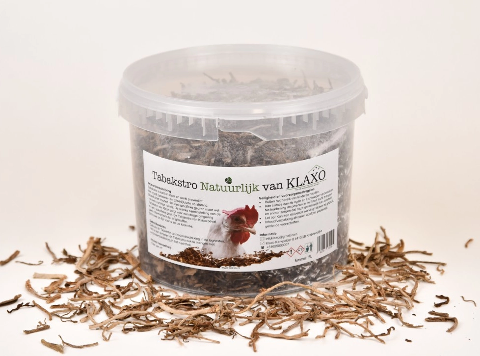 Tabakstro is kant-en-klaar en heeft een preventieve werking tegen bloedluis. Het houdt parasieten en (bloed) mijten op afstand door de sterke geur van Tabakstro. Bloedluizen houden niet van specifieke geuren. Bloedluizen leven graag in een vochtige omgeving. Door de Tabakstro te combineren met de formule van Klaxo ontstaat een dubbele werking tegen ongenode gasten. Deze combinatie zorgt ervoor dat het legnest en nachthok van uw dierenverblijf een droge omgeving blijft. De tabakstro is verpakt in een handige 5 liter emmer en is weer eenvoudig te sluiten. Zo blijft de geur beperkt tot de plaats waar deze hoort. Inhoud emmer: 5 liter. Gebruiksadvies: 1 liter per m2. De tabakstro van Klaxo bevat geen chemische hulp- of gifstoffen. Dit is wel zo fijn voor u en uw kleinvee. Als een kip gebruik maakt van het legnest/nachthok zal de toevoeging naar de bodem zakken. Hier krijgt deze dezelfde werking als de natuurkalk van Klaxo.