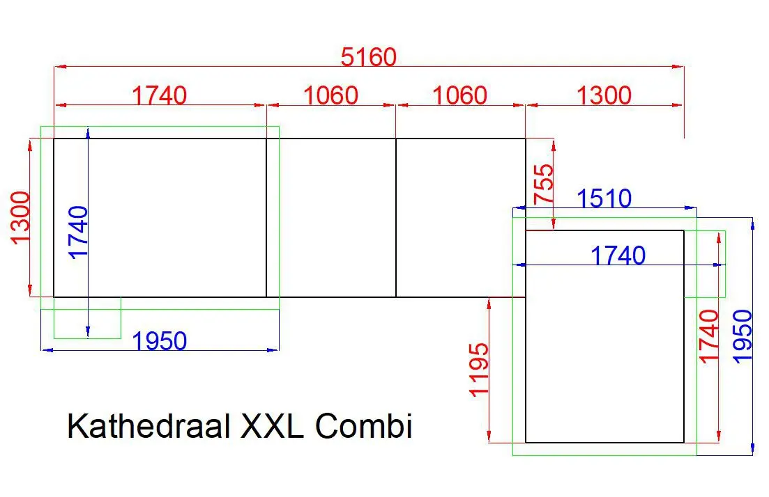 Max. afmeting: 564x250/174x181cm | Grondmaat: 516x239cm