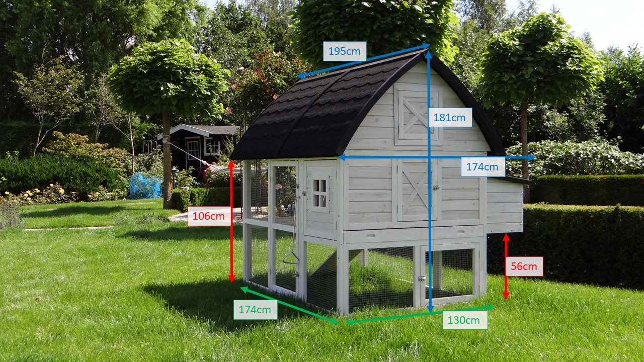 Buitenwerkse afmeting nachthok incl. dak en nestkast (BxDxH) 564x250/174x181cm