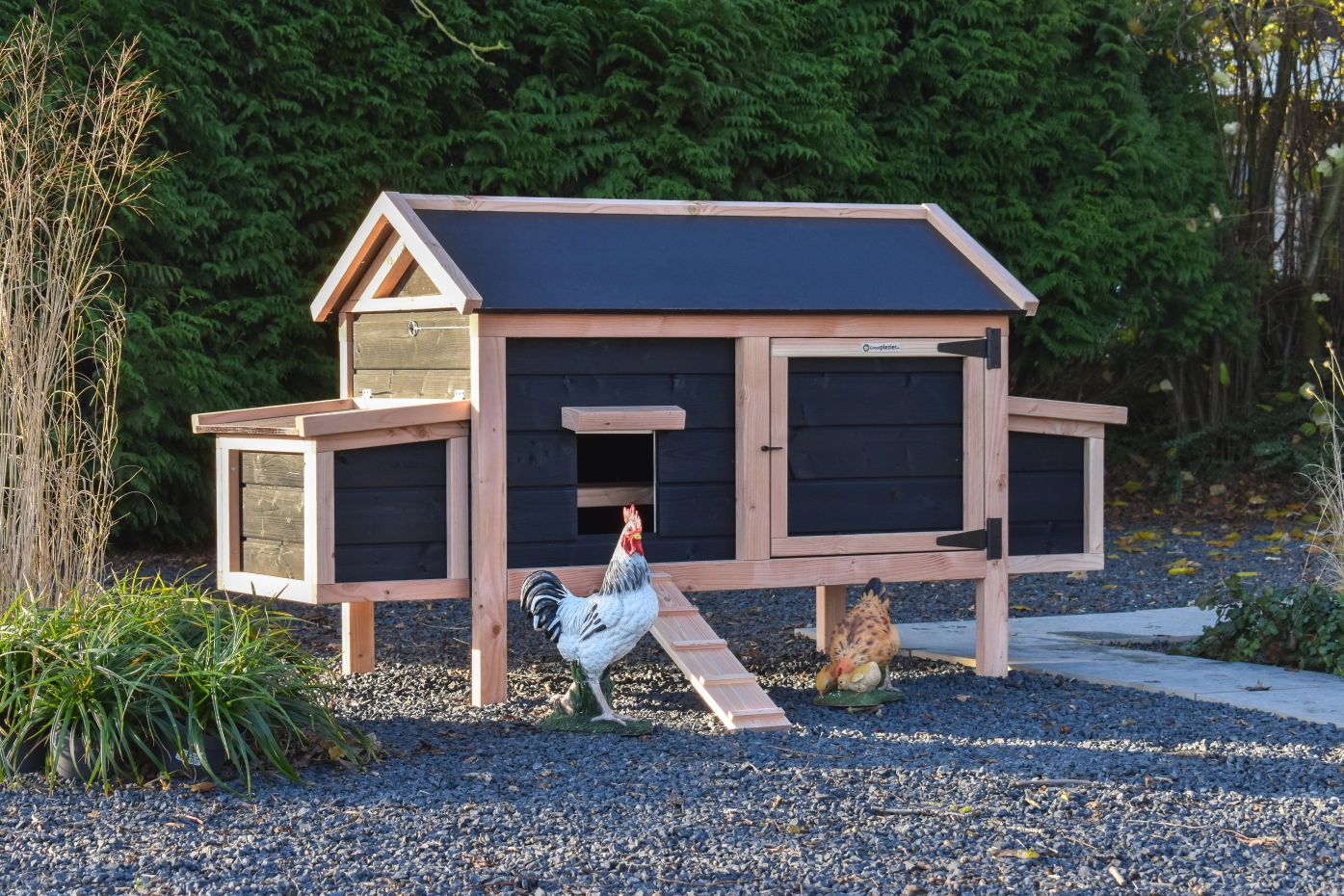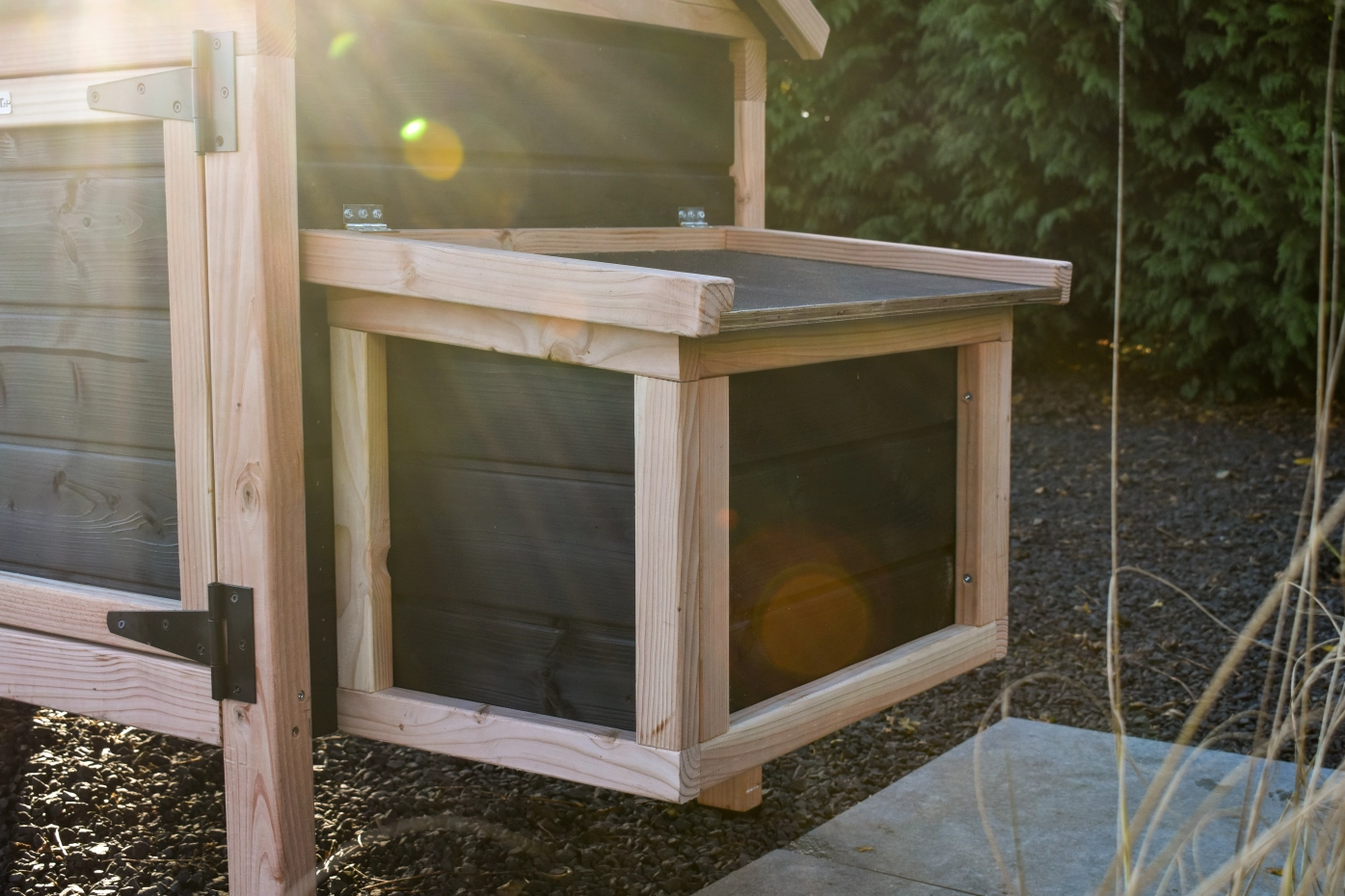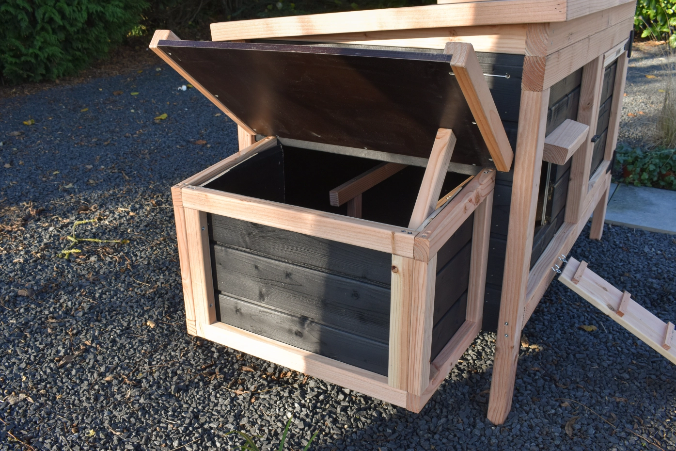 Dit lage model met 2 legnesten is gemakkelijk schoon te maken dankzij het scharnierende dak en het handige deurtje aan de voorkant. De legnesten hebben ook een scharnierend dak en hebben een makkelijk uitneembare bodemplaat. De combinatie douglas zwart geeft het hok een chique uitstraling.