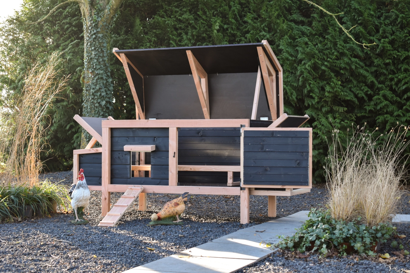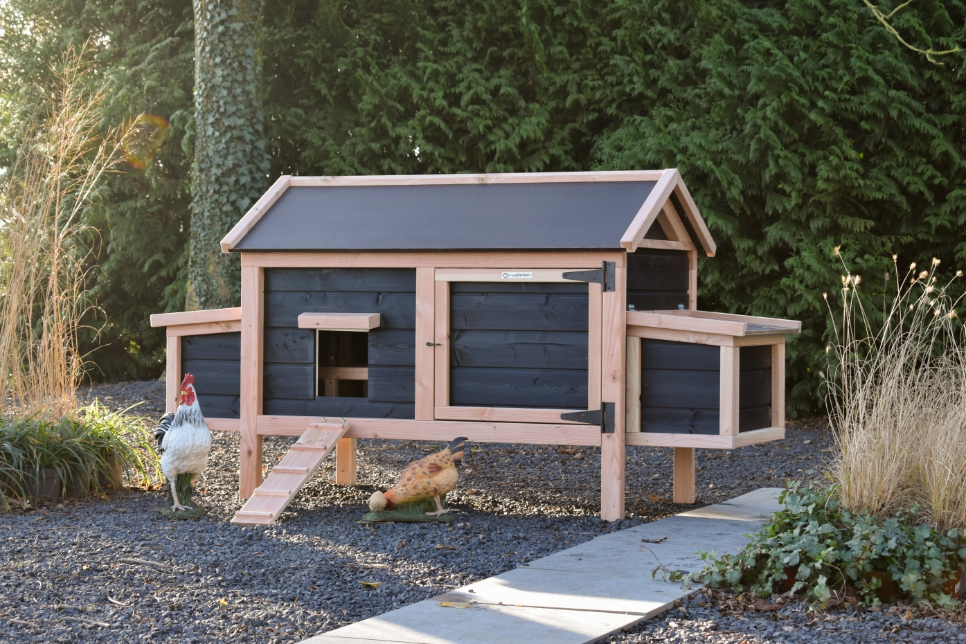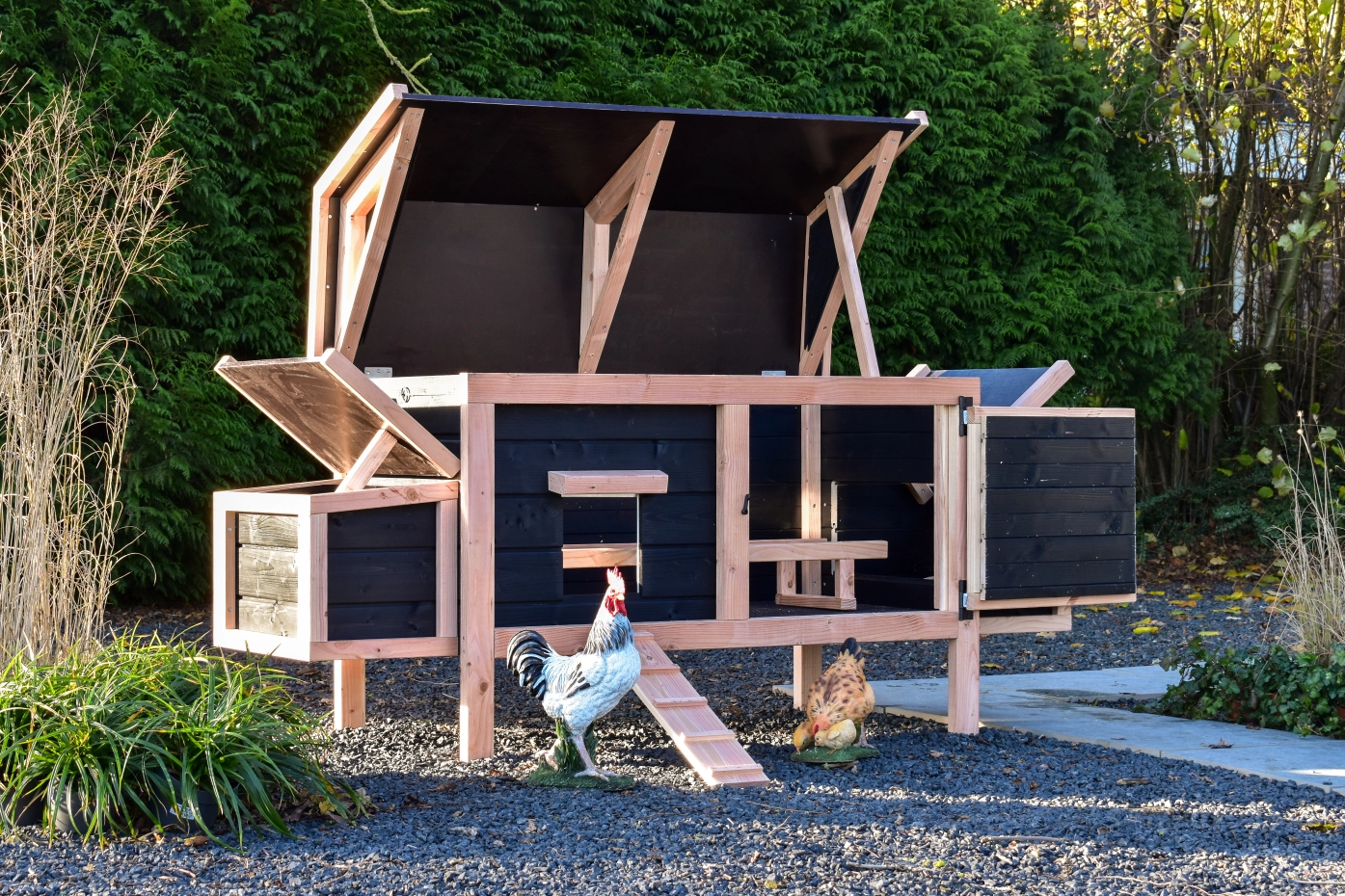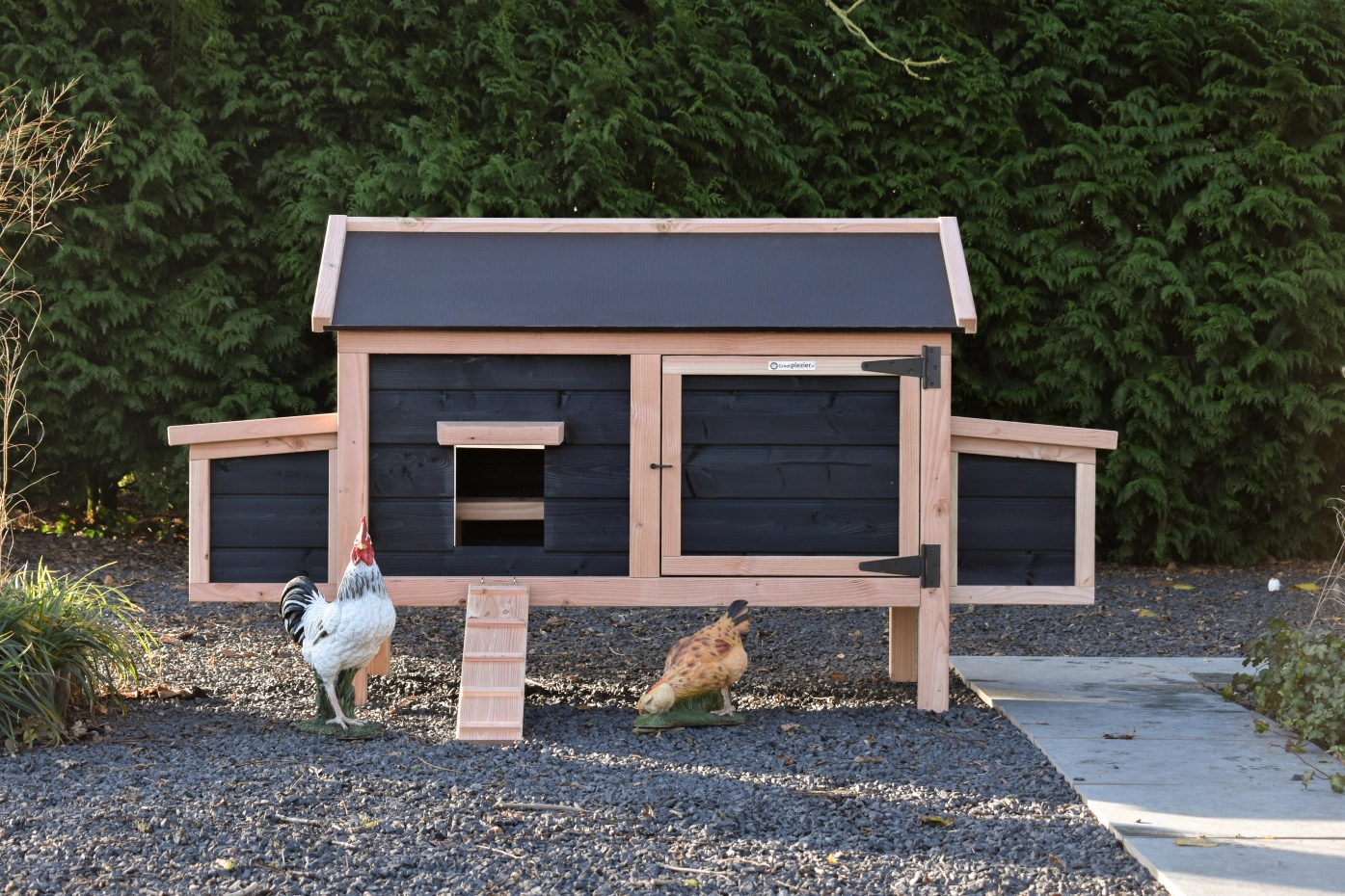 Dit lage model met 2 legnesten is gemakkelijk schoon te maken dankzij het scharnierende dak en het handige deurtje aan de voorkant. De legnesten hebben ook een scharnierend dak en hebben een makkelijk uitneembare bodemplaat. De combinatie douglas zwart geeft het hok een chique uitstraling.