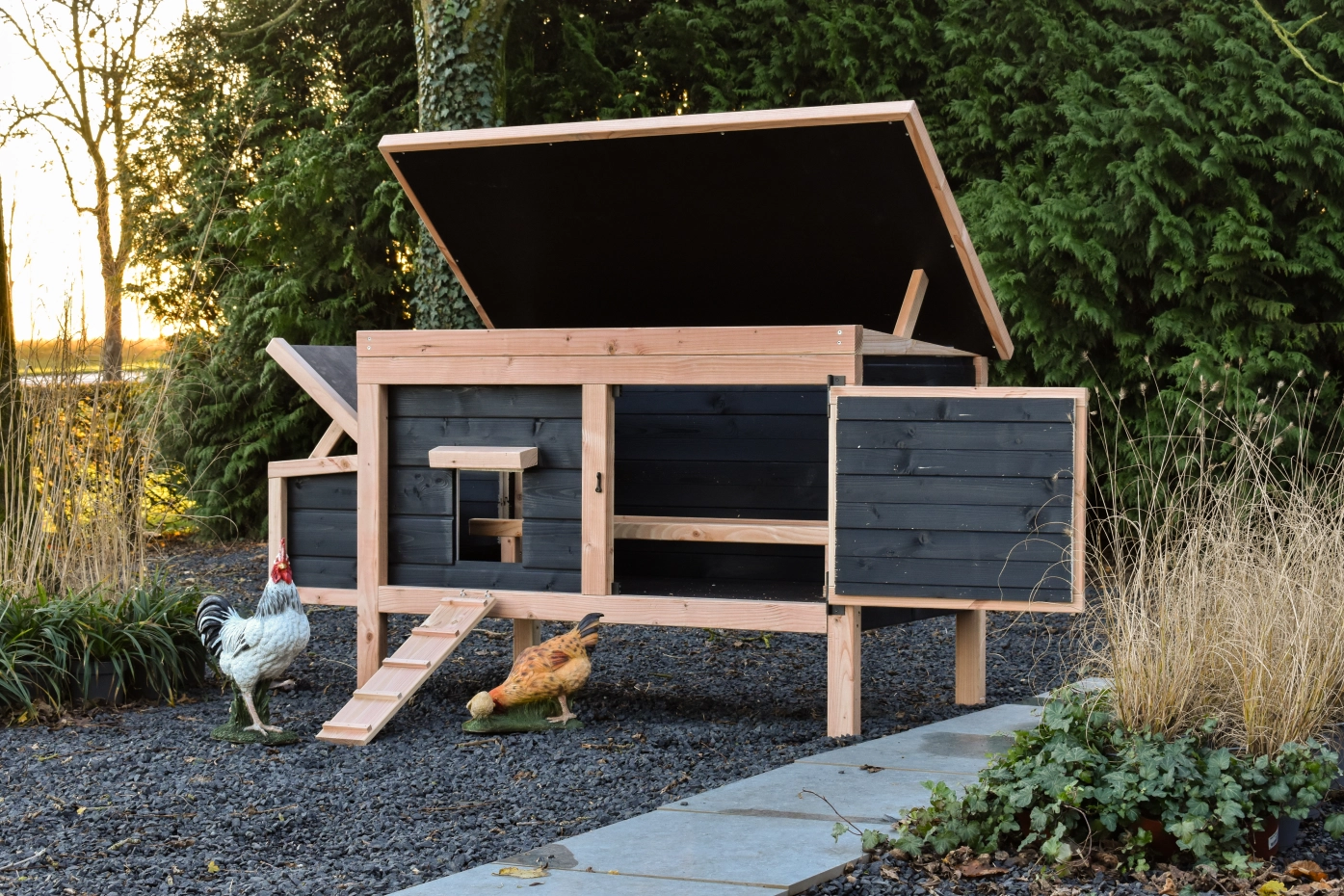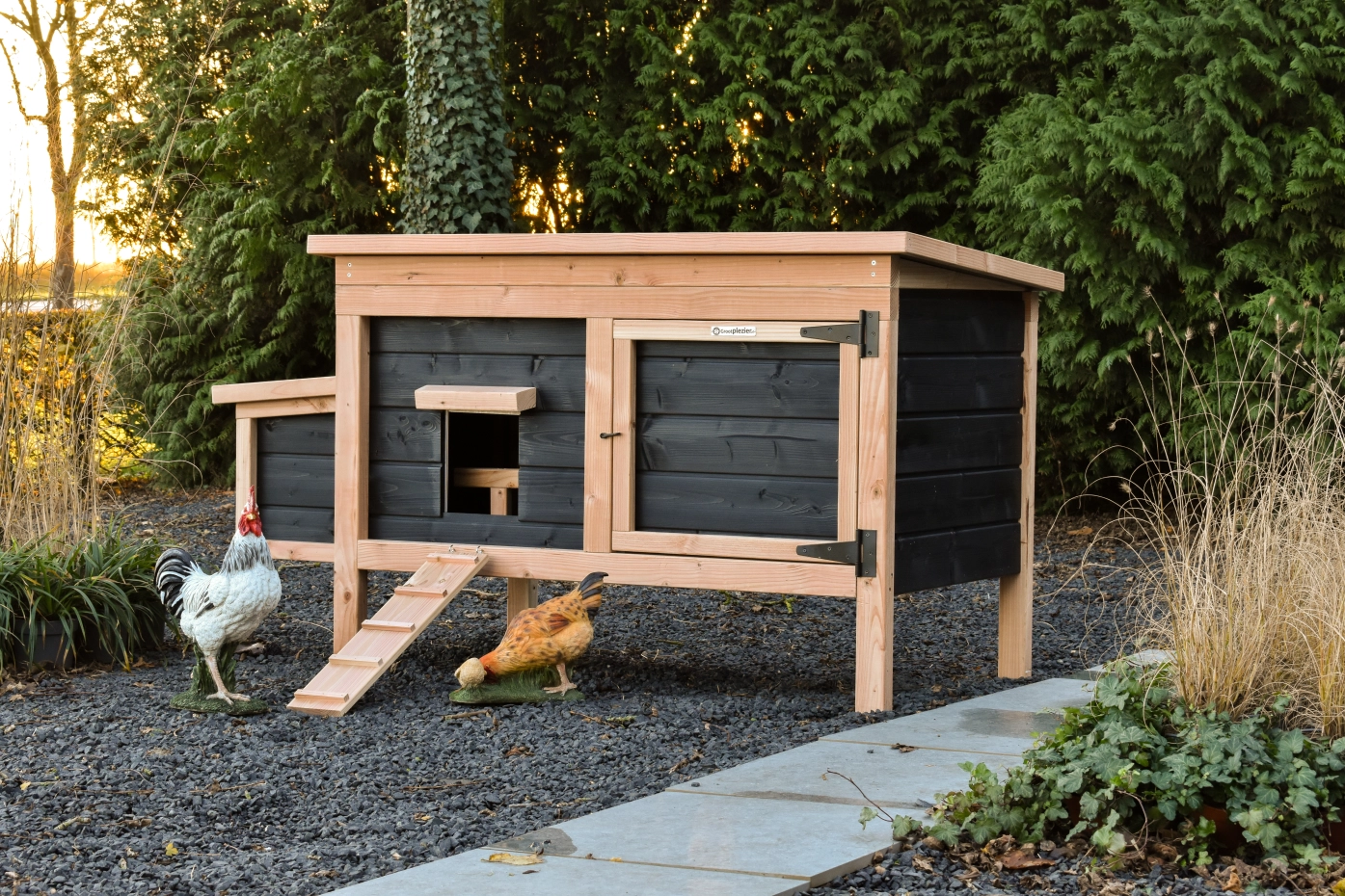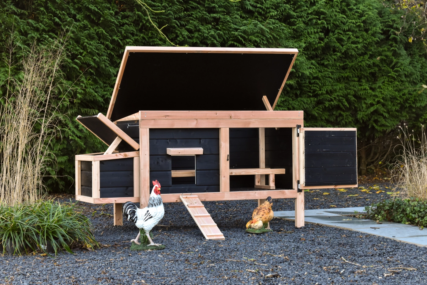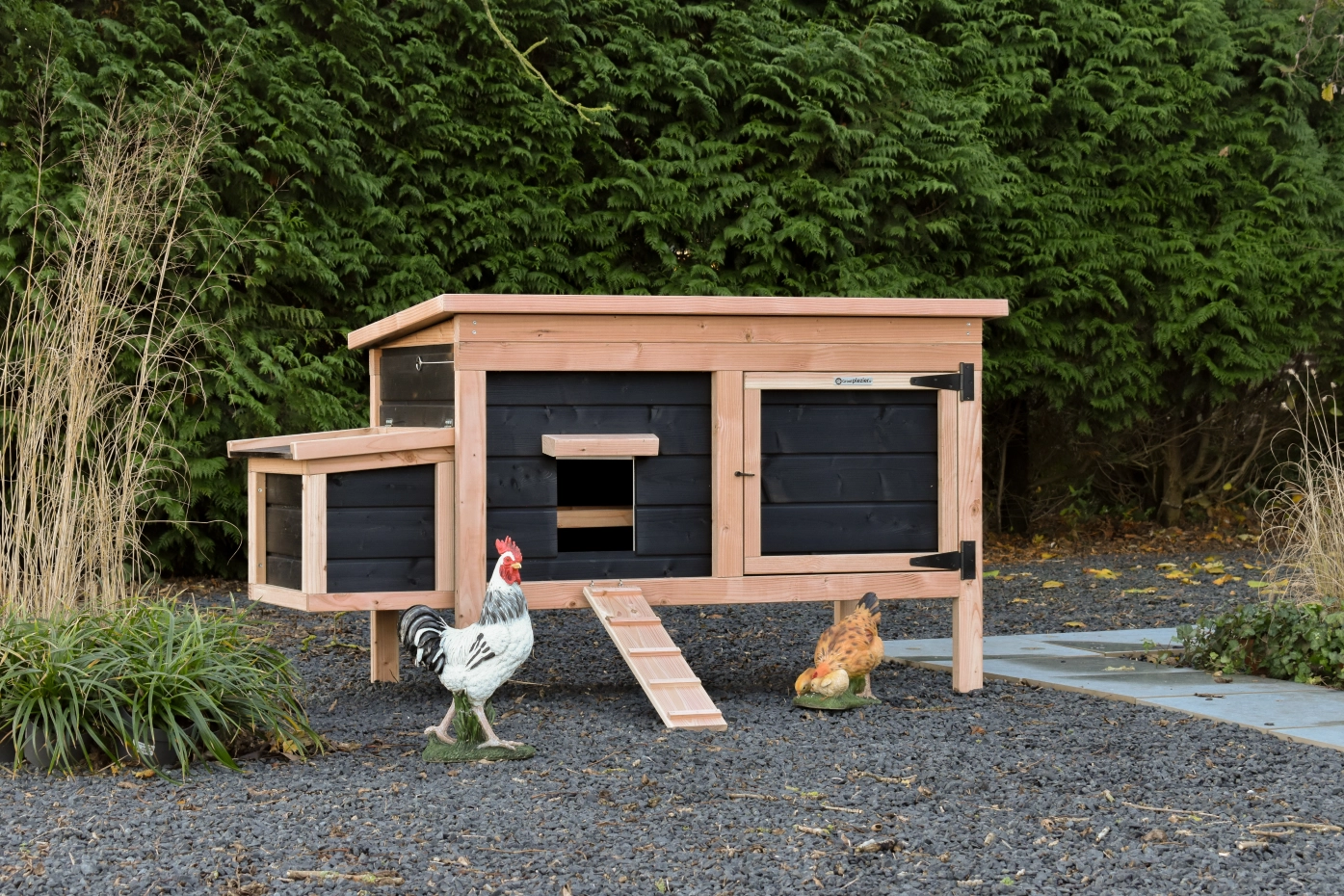 Dit lage model met legnest is gemakkelijk schoon te maken dankzij het scharnierende dak en het handige deurtje aan de voorkant. Het legnest heeft ook een scharnierend dak en heeft een makkelijk uitneembare bodemplaat. De combinatie douglas zwart geeft het hok een chique uitstraling.