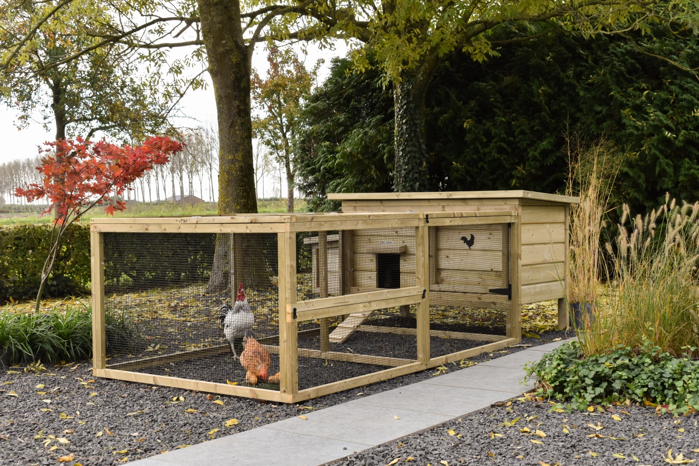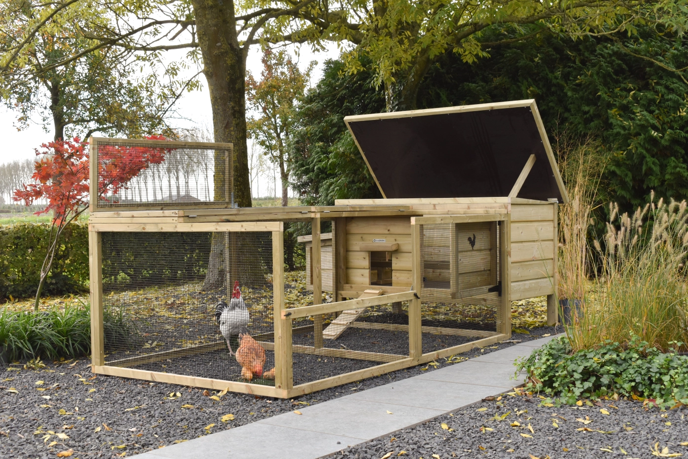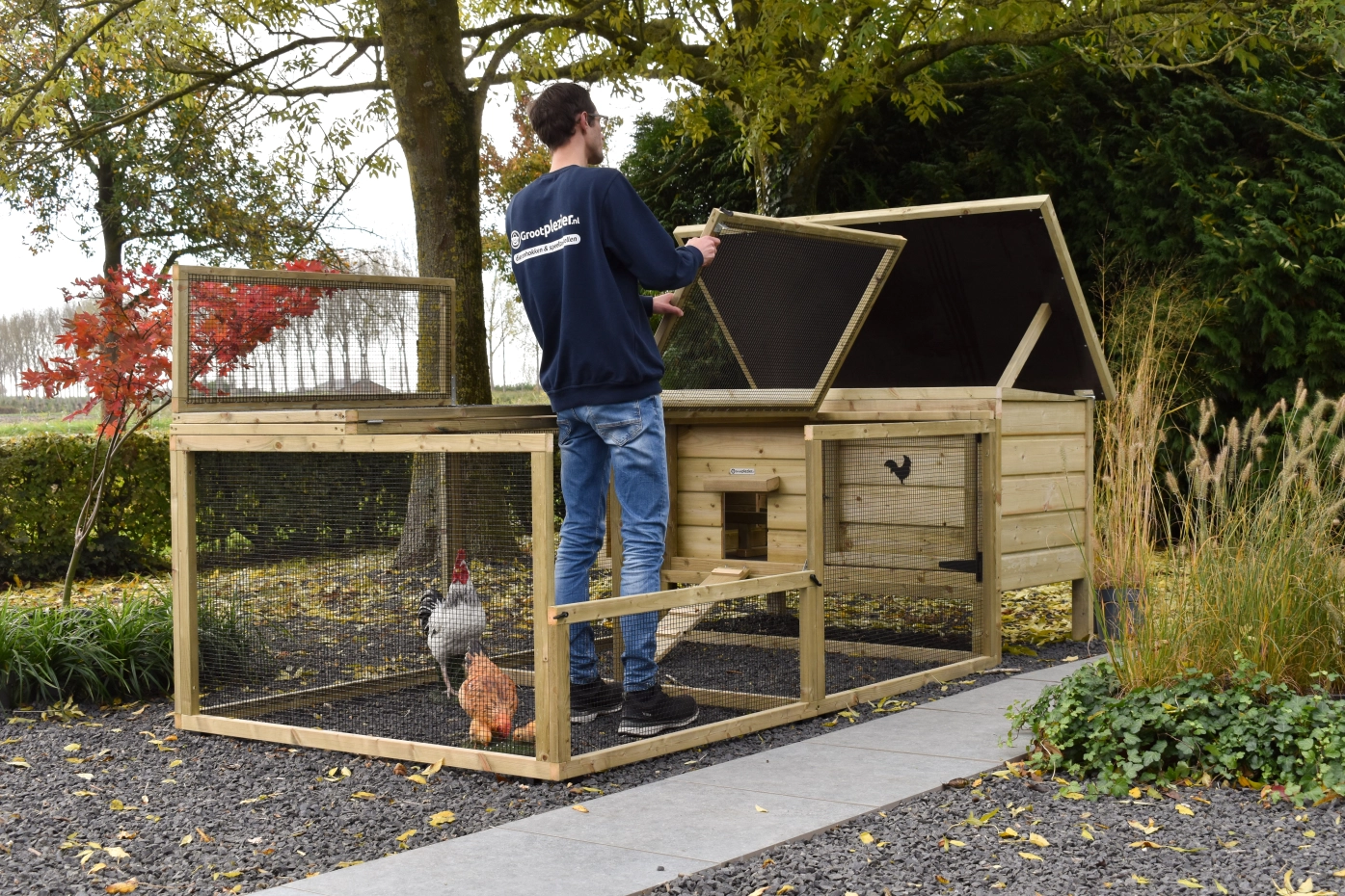 • Afsluitbaar nachthok: voorzien van aluminium schuifluik aan de binnenzijde