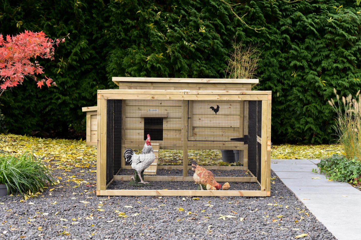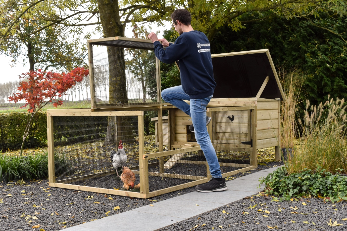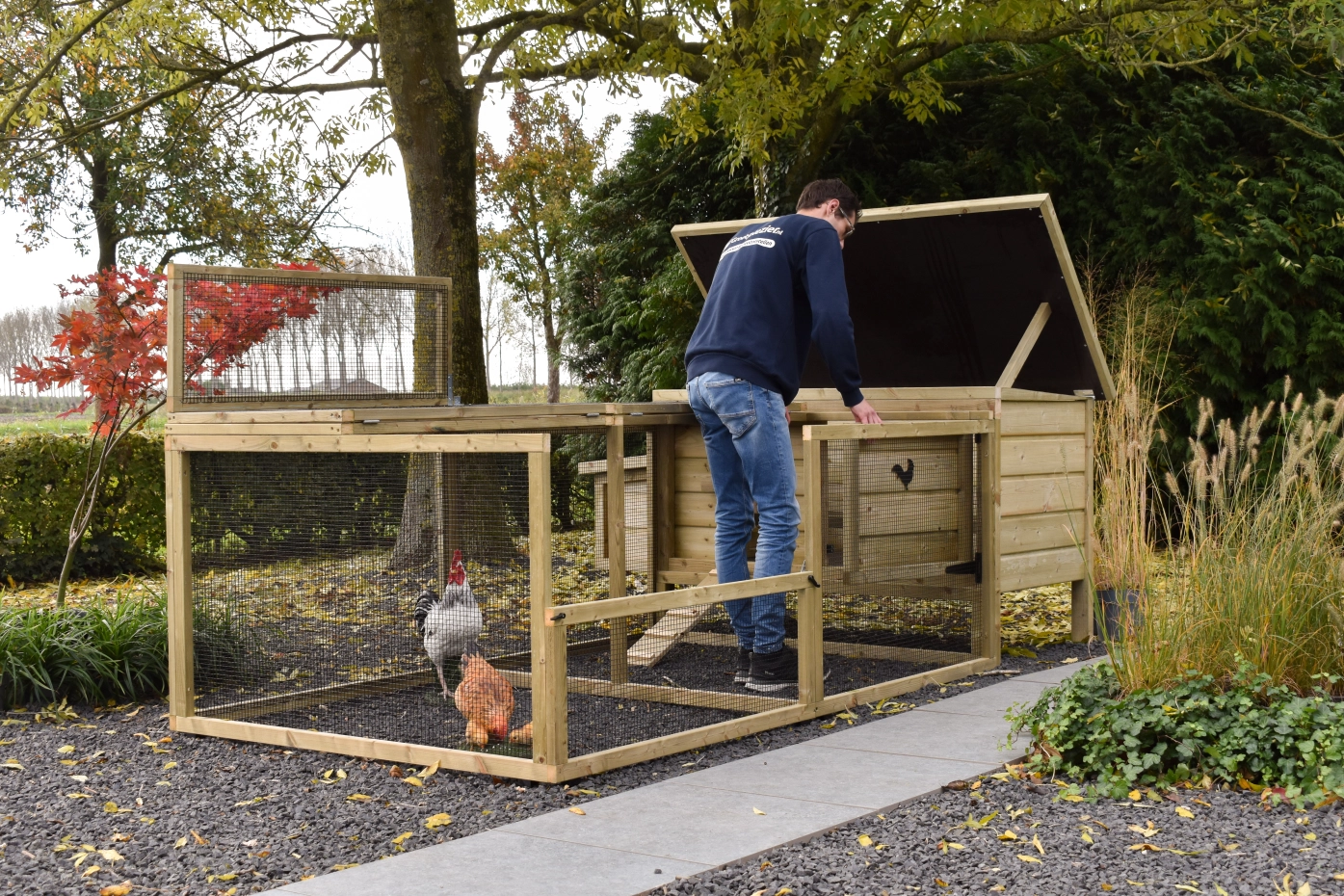 • Afsluitbaar nachthok: voorzien van aluminium schuifluik aan de binnenzijde