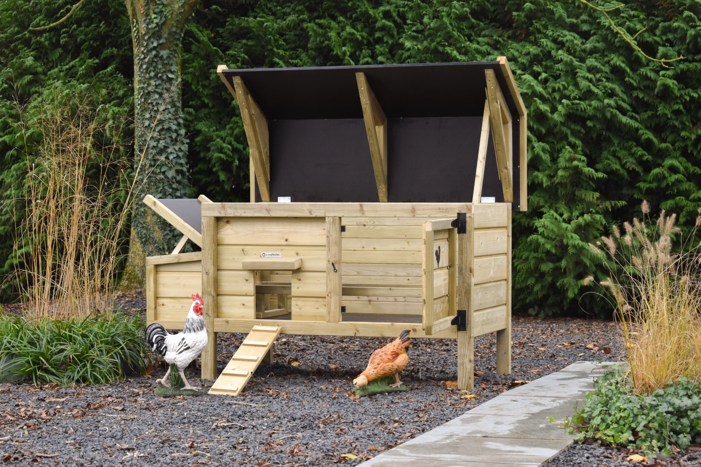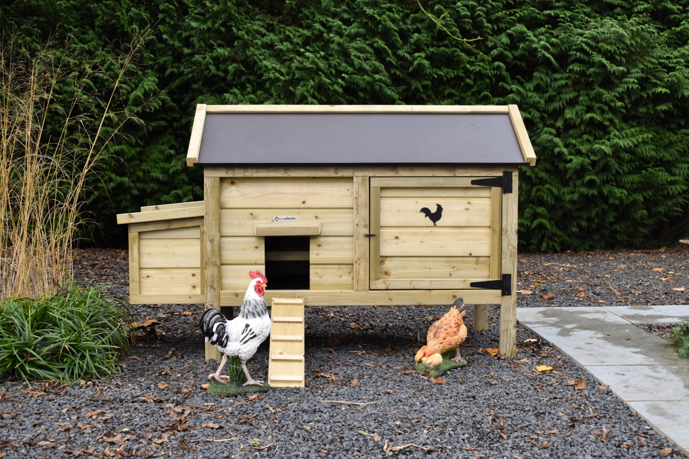 Dit lage model met legnest is gemakkelijk schoon te maken dankzij het scharnierende dak en het handige deurtje aan de voorkant. Het legnest heeft ook een scharnierend dak en heeft een makkelijk uitneembare bodemplaat. Voor een leuk detail op het deurtje kunt u een leuk houten diertje mee bestellen. Dit geeft het hok een extra charmante uitstraling!