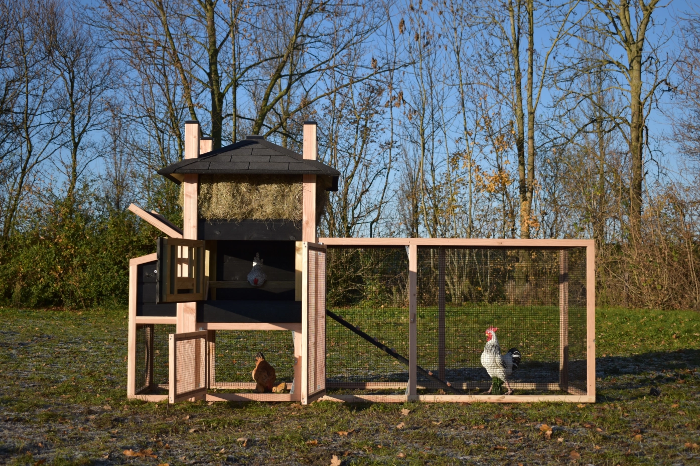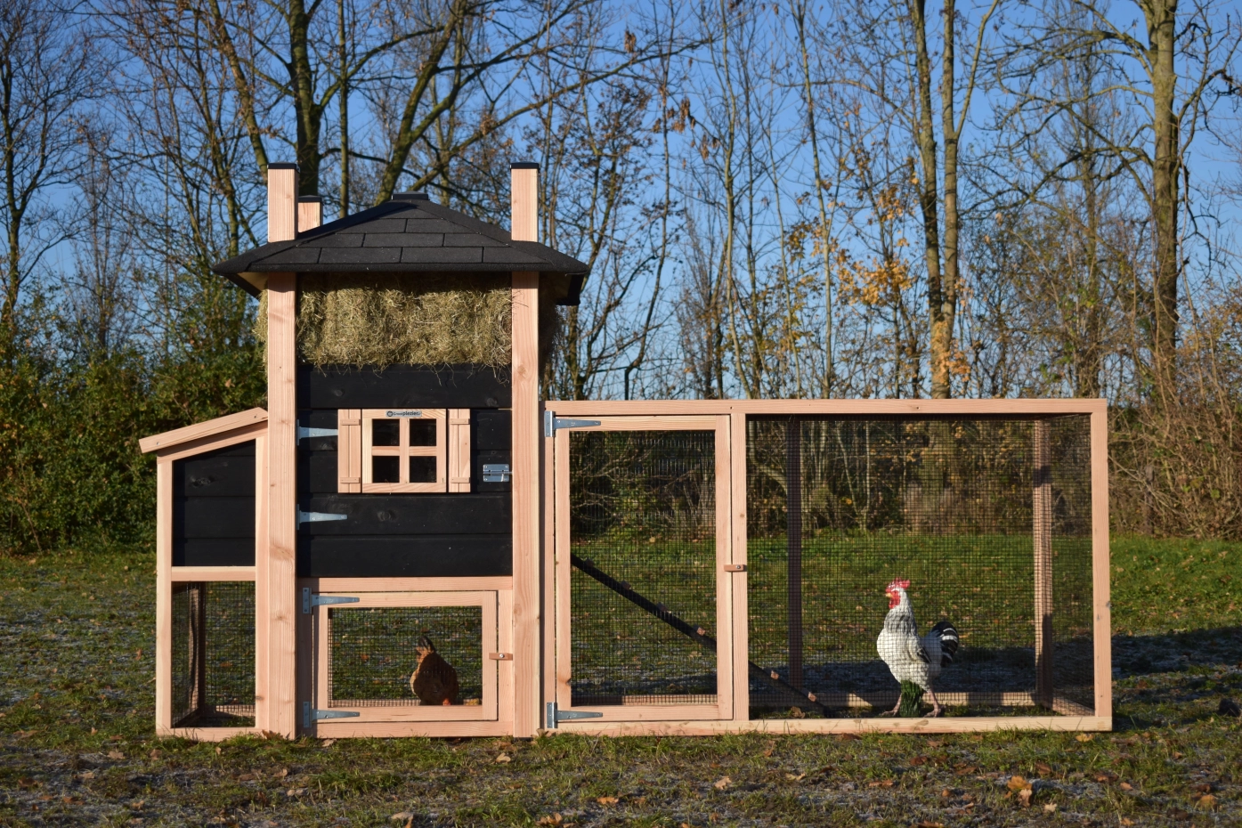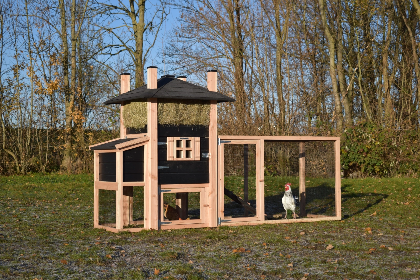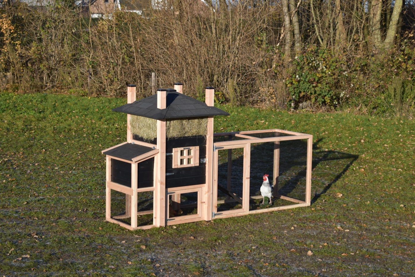Kippenhok hooiberg Rosa Douglas-zwart met legnest en aanbouw ren. Prachtig hok met luxe design! Mooi puntdak met hooi eronder! Landelijke stijl met prachtige details. Door het Douglas en zwarte hout hebt u echt het hooiberg effect! Praktisch hok met lange levensduur, Het legnest is toegankelijk door middel van het draaibaar dakje. Onder het hok en legnest kunnen uw kippen lekker schuilen tegen de regen. Door de mooie prijs en degelijk hok een echte aanrader!