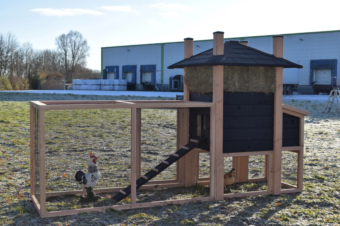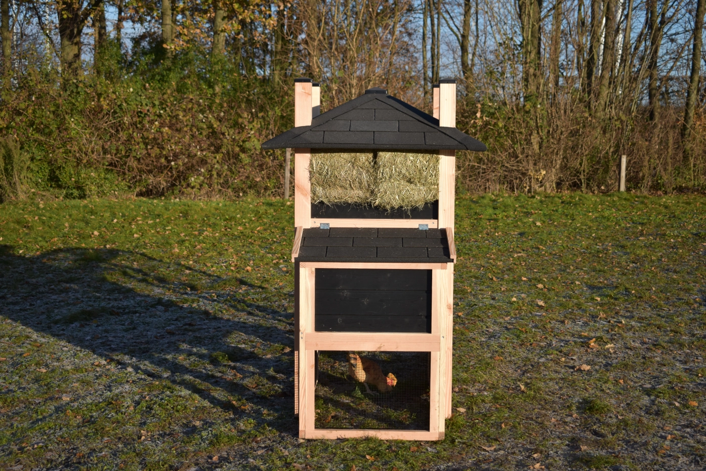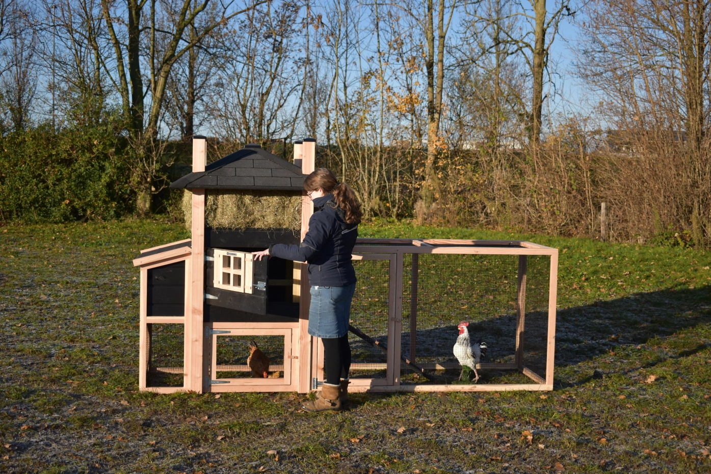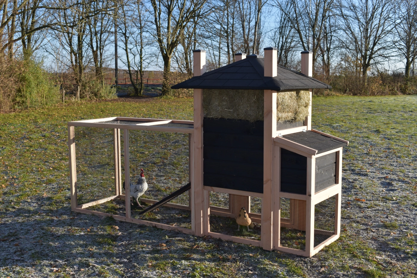 Kippenhok hooiberg Rosa Douglas-zwart met legnest en aanbouw ren. Prachtig hok met luxe design! Mooi puntdak met hooi eronder! Landelijke stijl met prachtige details. Door het Douglas en zwarte hout hebt u echt het hooiberg effect! Praktisch hok met lange levensduur, Het legnest is toegankelijk door middel van het draaibaar dakje. Onder het hok en legnest kunnen uw kippen lekker schuilen tegen de regen. Door de mooie prijs en degelijk hok een echte aanrader!