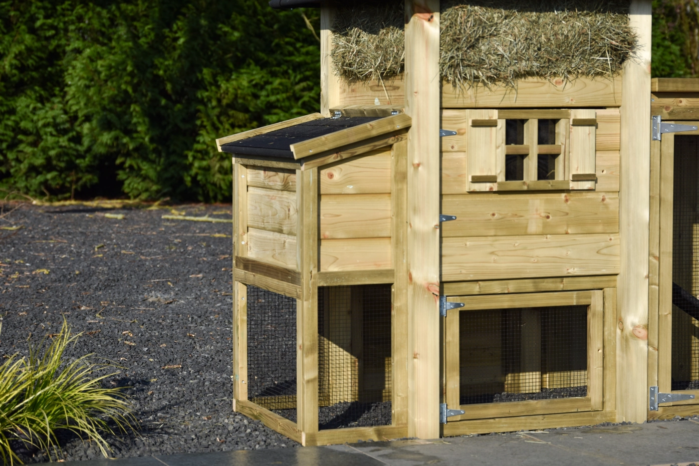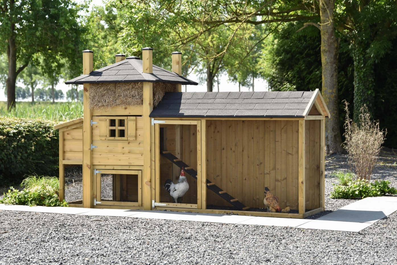 Kippenhok hooiberg Rosa met legnest en ren met dak shingles. Doordat het dak van dezelfde dakshingles gemaakt is hebt u een mooie gestroomlijnde combinatie. U hebt optimale ruimte voor uw kippen en is tevens van alle gemakken voorzien. Door de brede deur kunt u gemakkelijk schoon maken. De deur is voorzien van kruisraam en geeft een prachtig en sfeervol geheel. Via het dakje van het legnest kunt u zonder te storen de eieren pakken. Het hooi en het puntdak geven dit hok een prachtige uitstraling. De ren heeft een dichte achterkant zodat de kippen lekker beschut kunnen rusten.