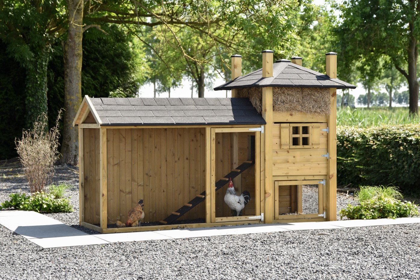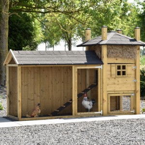 Kippenhok hooiberg Rosa met zijn shingles-dak ren is een prachtige combinatie. Doordat het dak van de ren ook van shingles is, is het een mooi geheel. Dit stukje vakwerk maakt uw tuin een stuk gezelliger en geeft u een gevoel van landelijk wonen. Aan het hok zit een ruime ren met een water dicht dak. De ruime deuropening geeft u goed ruimte om schoon te maken. Ook in het kippenhok zit een brede deur voor een gemakkelijke toegang. De ren heeft een dichte achterkant zodat de kippen lekker beschut kunnen rusten.