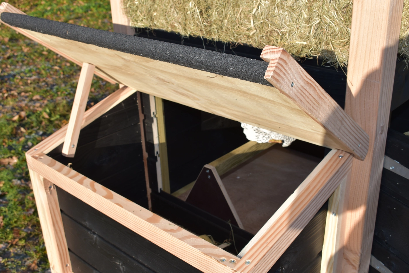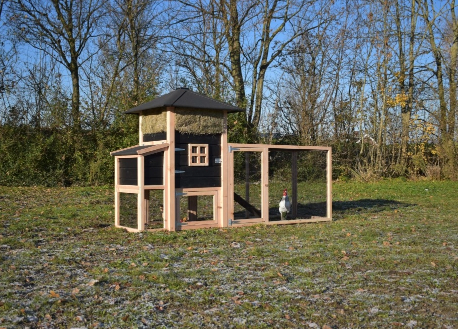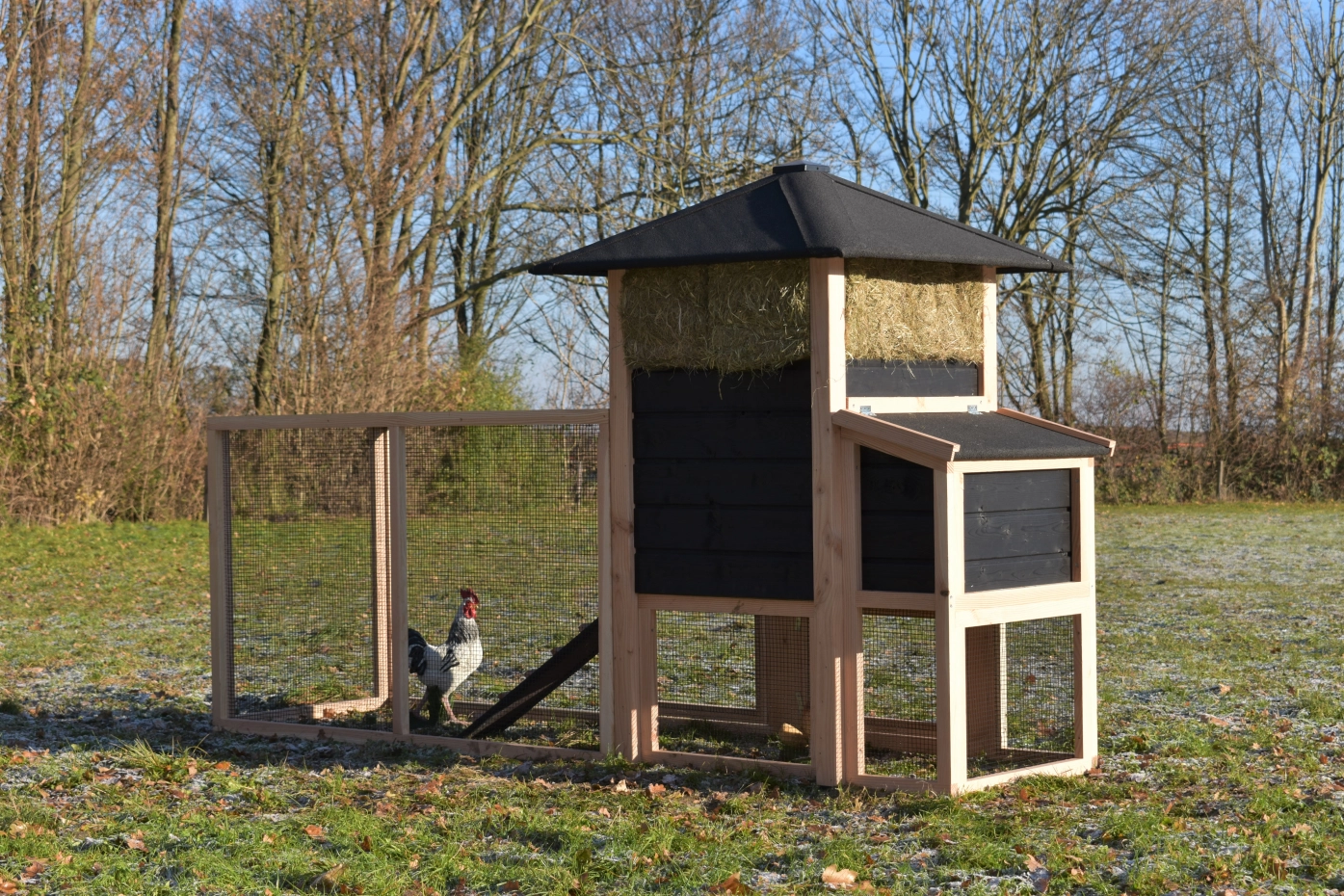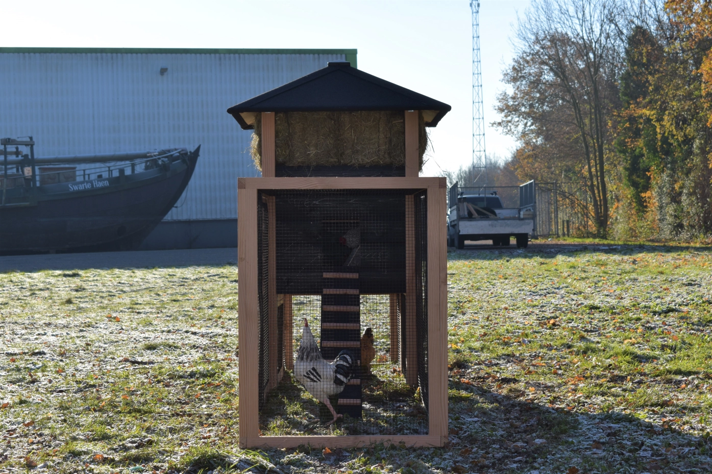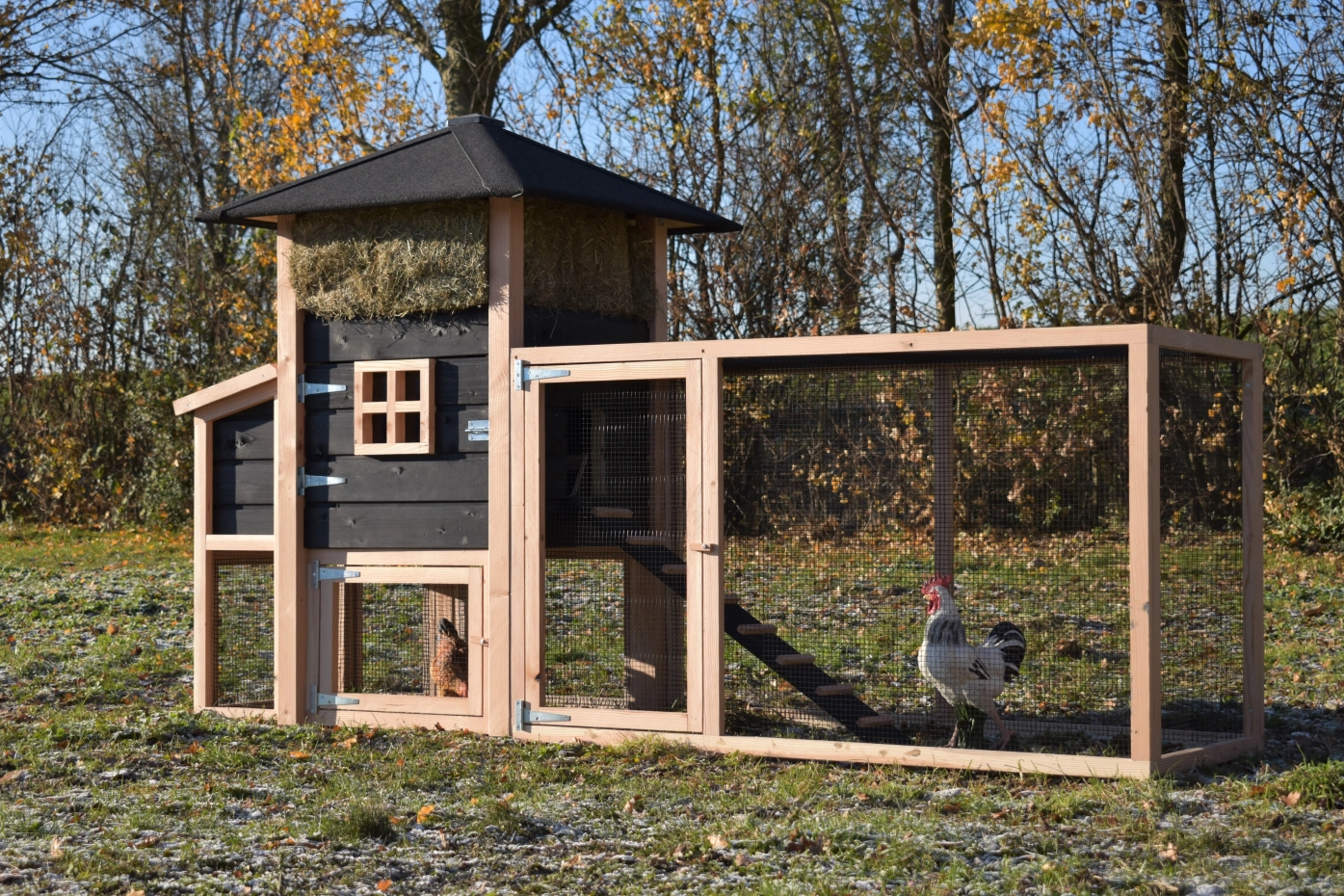 Kippenhok hooiberg Rosanne Douglas/zwart met legnest en aanbouwren. Leuk hok met ruime ren en luxe legnest. Handig in gebruik met goede kwaliteit hout en een mooi design. Alles wat u nodig hebt om uw kippen een prima verblijf te geven! Het legnest is voorzien van de scharnierend dak, dit maakt eieren rapen een makkie. De ren is ruim en omdat het nachthok hoog op poten staat kunnen de kippen ook lekker droog staan als het regent. Een praktisch hok met ruime toegangsdeuren. Mooi uiterlijk met een landelijke stijl! Prijs kwaliteit verhouding is heel goed. een echte aanrader!