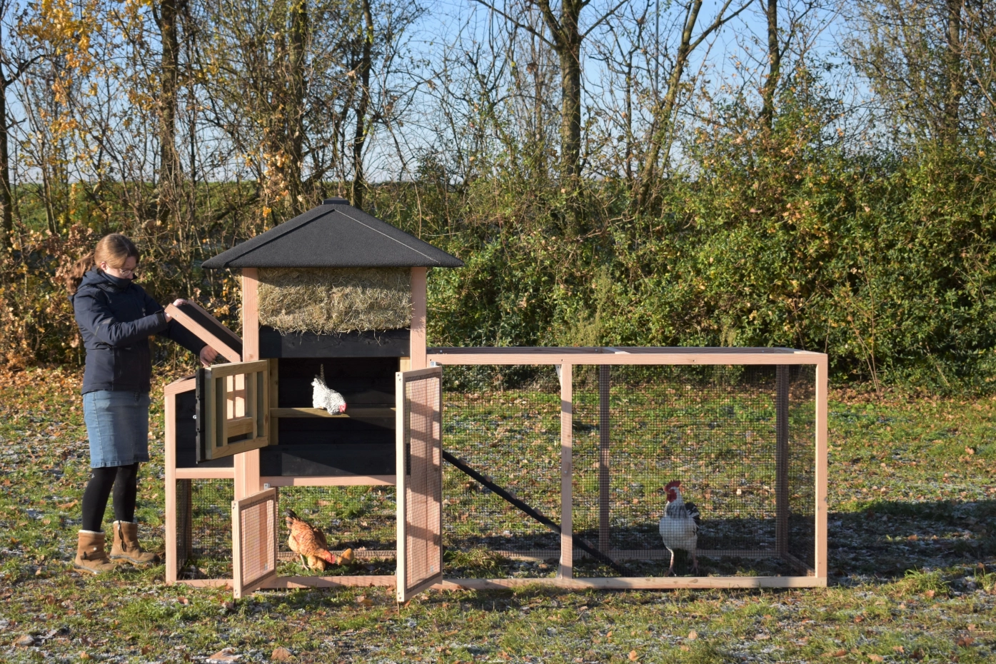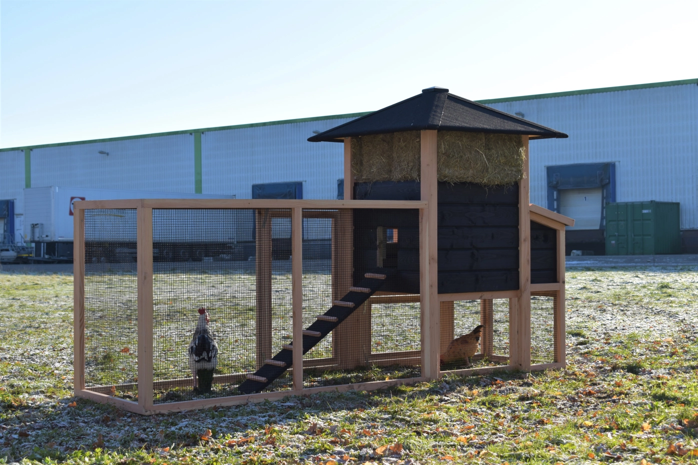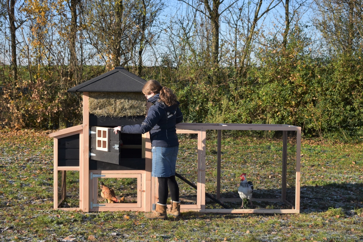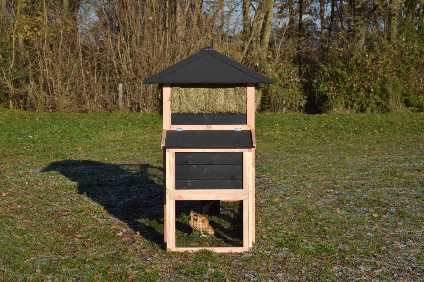 Kippenhok hooiberg Rosanne Douglas/zwart met legnest en aanbouwren. Leuk hok met ruime ren en luxe legnest. Handig in gebruik met goede kwaliteit hout en een mooi design. Alles wat u nodig hebt om uw kippen een prima verblijf te geven! Het legnest is voorzien van de scharnierend dak, dit maakt eieren rapen een makkie. De ren is ruim en omdat het nachthok hoog op poten staat kunnen de kippen ook lekker droog staan als het regent. Een praktisch hok met ruime toegangsdeuren. Mooi uiterlijk met een landelijke stijl! Prijs kwaliteit verhouding is heel goed. een echte aanrader!