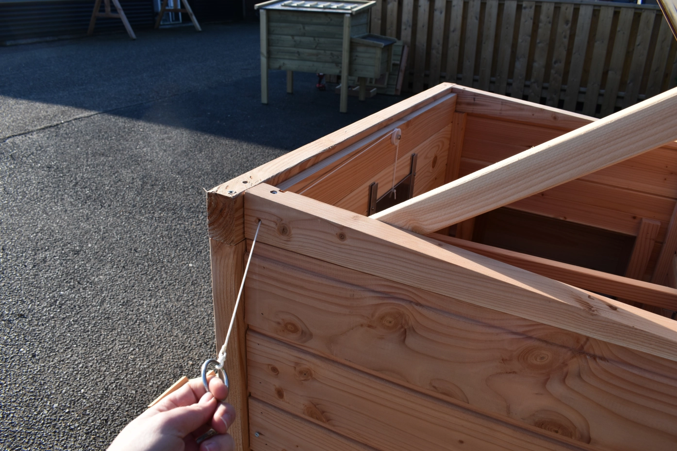 - Wanneer het hok niet op een beschutte plaats staat, dan adviseren wij om het te verankeren