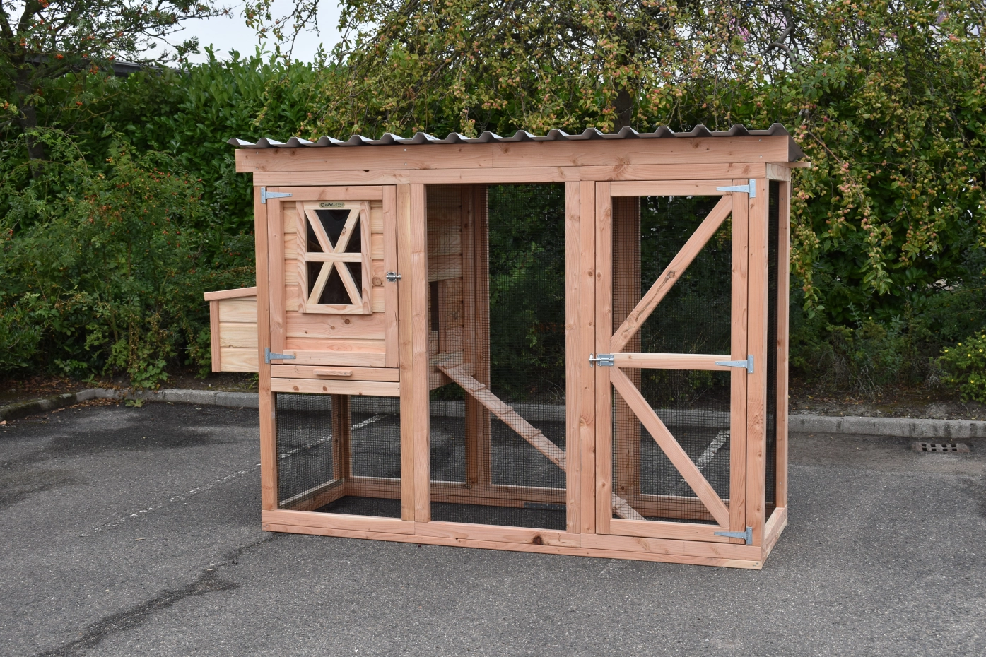 Dit kippenhok is een handig en duurzaam hok helemaal gemaakt van Douglashout en voorzien van handige details. Zo heeft het grote deur om in de ren te komen en een deurtje naar het nachthok. Het nachthok is voorzien van zitstokken, een lade en een handig legnest met scharnierdak.