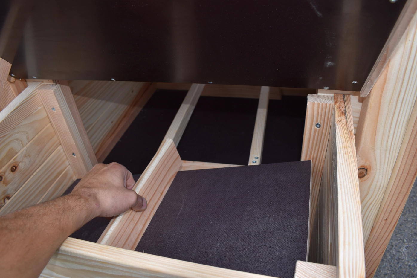 - Bij dit hok wordt een fundering meegeleverd van 4,5 cm hoog. Hierop worden de panelen vast geschroefd. Wij raden aan om een stevige en vlakke ondergrond te voorzien met bijvoorbeeld tegels of opsluitbanden.