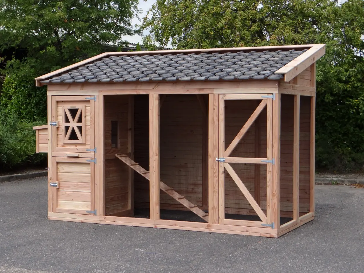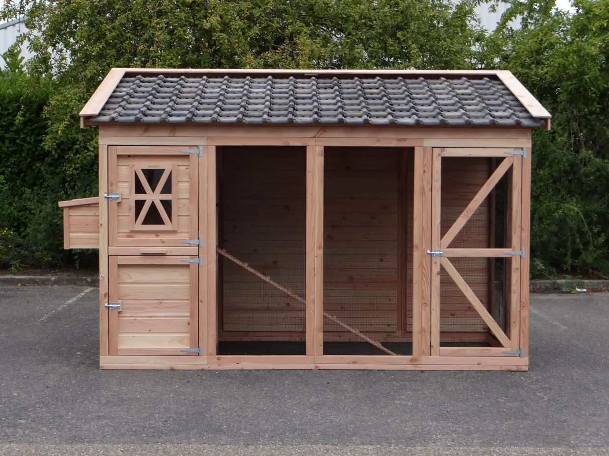 Kippenhok Flex 4.2 is een ruim en overzichtelijke kippenhok. In het nachthok kunnen de kippen op stok en vinden ze een legnest om een ei te kunnen leggen. Ook is het kippenhok goed toegankelijk door de grote deur in de kippenren. In deze ren is ook een luikje voorzien, waarmee u de kippen een vrije uitloop kunt geven. Verder is het handig dat er een schoonmaaklade in het nachthok zit.