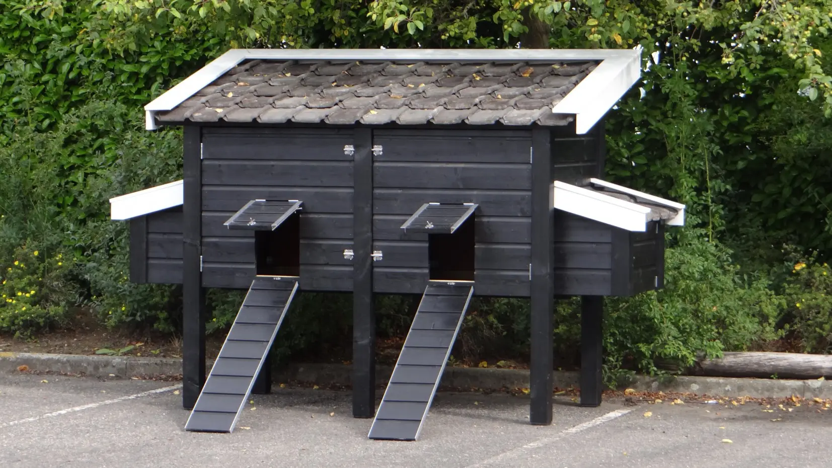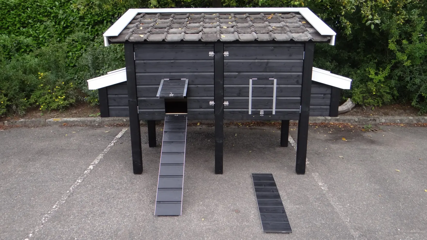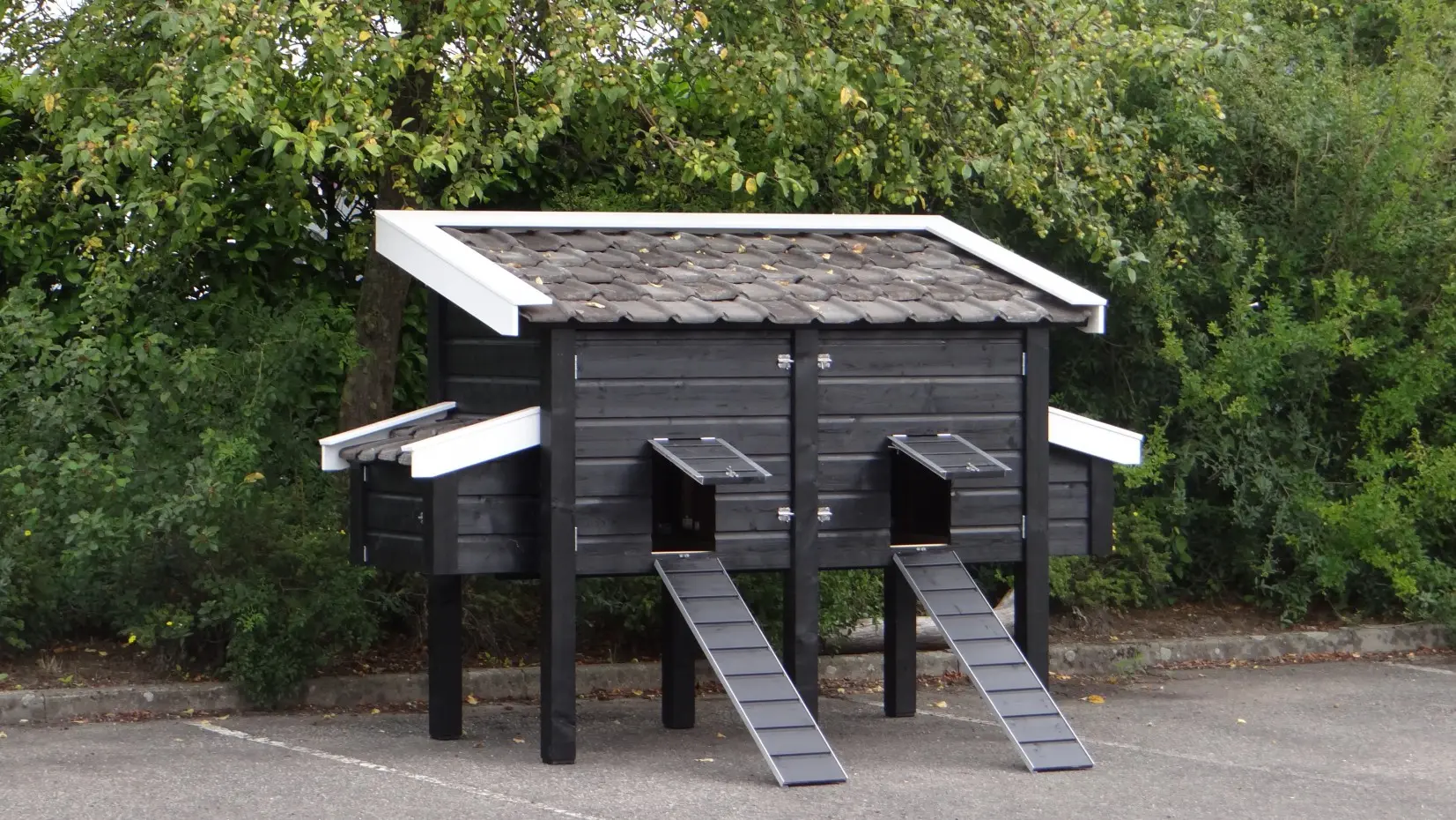Kippenhok Professional Dubbel zwart-wit is van zeer hoog kwaliteitsniveau. Geïmpregneerd hout, keramische dakpannen, RVS-sloten, aluminium afwerking, betonmultiplex beplating in de mestlades en legnest. Dit zijn stuk voor stuk materialen voor langdurig, prettig gebruik. Hoge kwaliteit, prachtig design en zeer veel gebruiksgemak. De maximale buitenwerkse afmetingen zijn 270x126x191cm (BxDxH). Deze afmetingen zijn incl. dak en nestkast, maar zonder de loopplanken.
