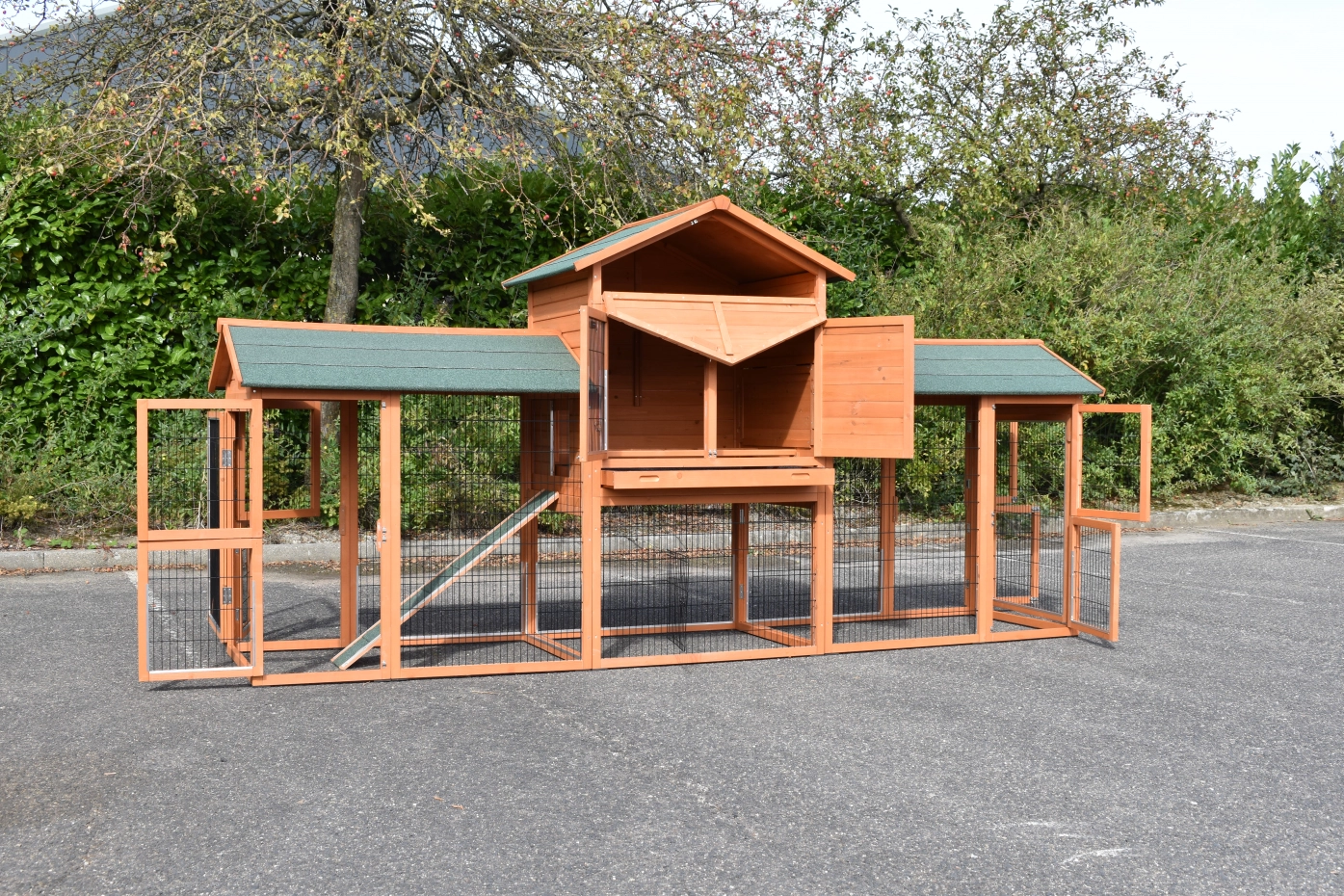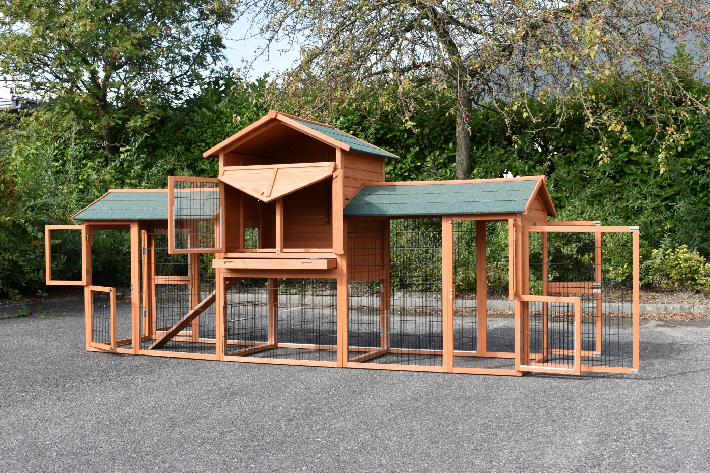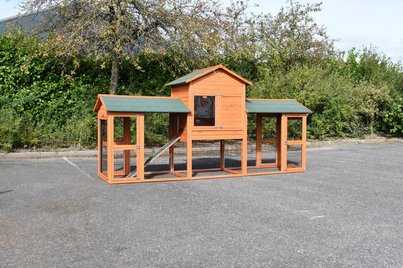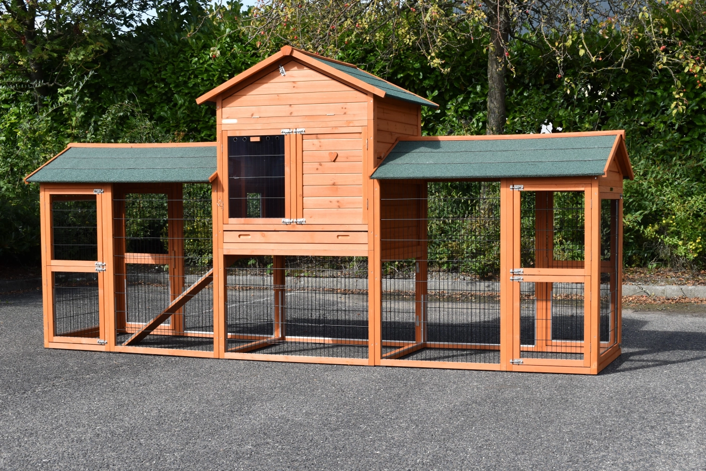 Dit kippenhok Prestige Large Dubbel heeft links en rechts een extra kippenren. Kippenhok Prestige Large Dubbel is voorzien van anti-knaagstrips en rubber voetjes. Dit hok met een dubbele kippenren is een geweldig en zeer royaal hok voor uw kippen. Een groot kippenhok wat tot in detail is afgewerkt, met diverse ruime deuren, een royaal nachthok en extra rennen. De totale buitenwerkse afmeting, incl. dak is 362x100x181cm.