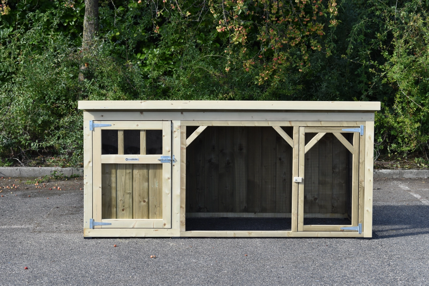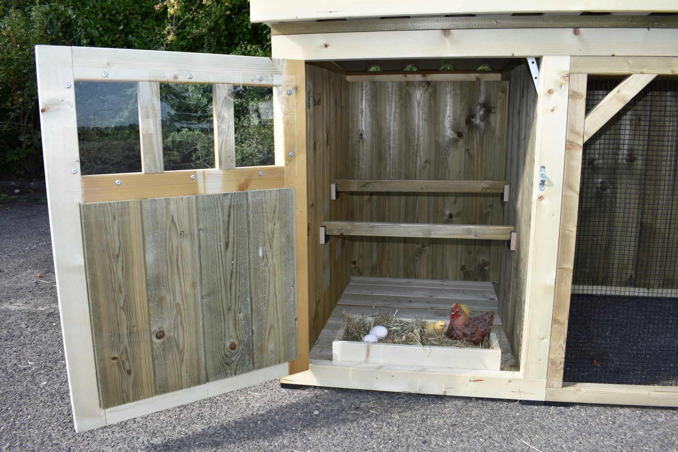 Kippenhok Belle 1 is een leuk en stevig kippenhok met overdekte, goed beschutte ren. In het nachthok is een legbak, zitstokken en een geïmpregneerd houten bodem voorzien. Omdat we het hok zelf maken en door het gebruik van goede kwaliteit materialen, is het erg onderhoudsvrij.