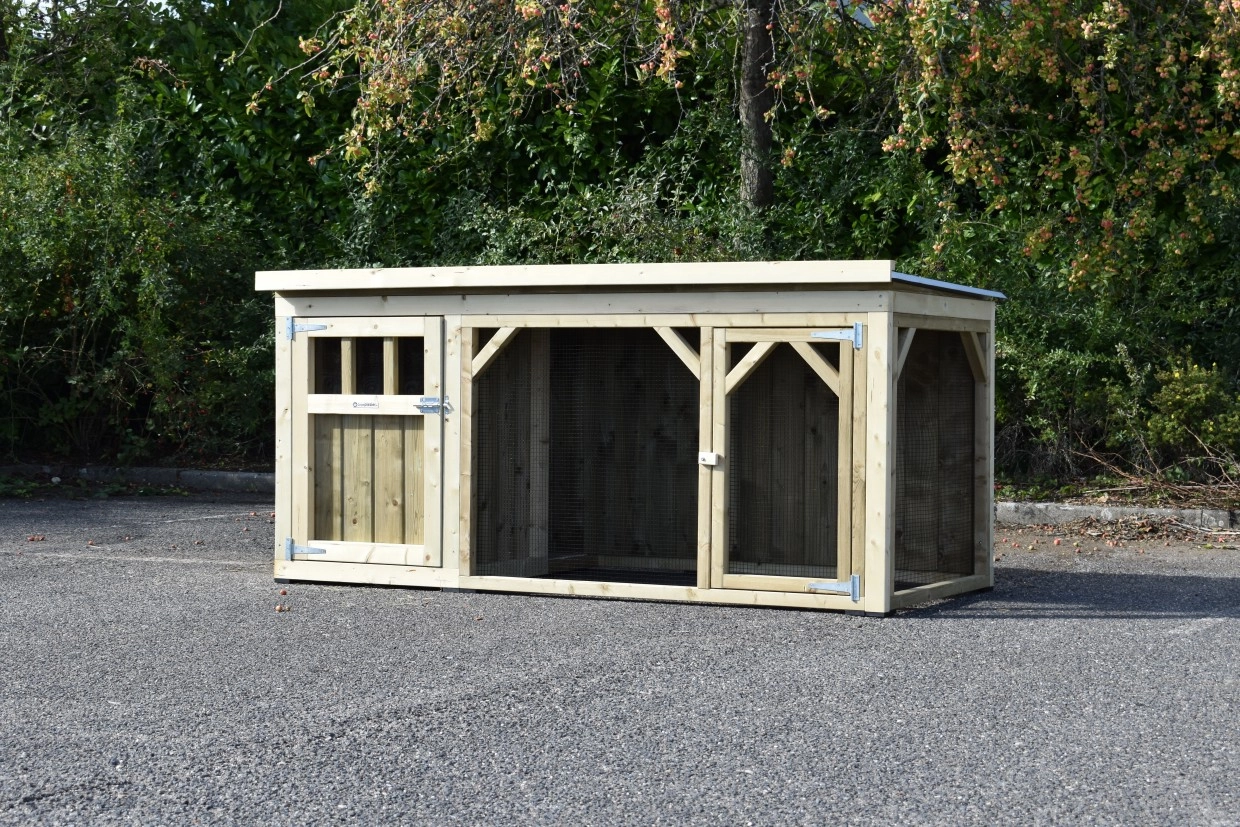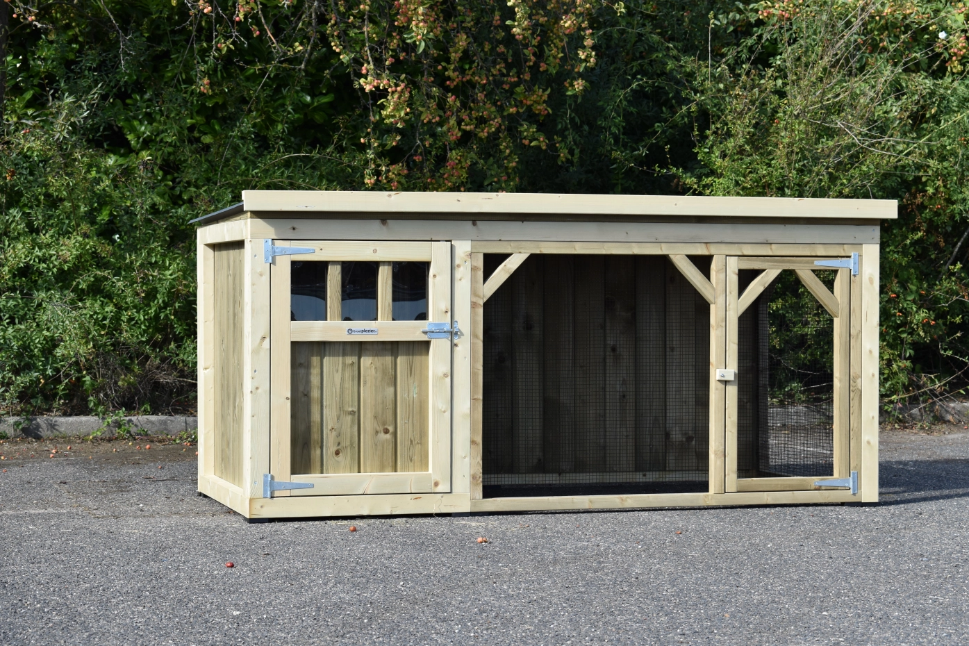 Kippenhok Belle 2 is een leuk en stevig kippenhok met overdekte ren. In het nachthok is een legbak, zitstokken en een geïmpregneerd houten bodem voorzien. Omdat we het hok zelf maken en door het gebruik van goede kwaliteit materialen, is het erg onderhoudsvrij.