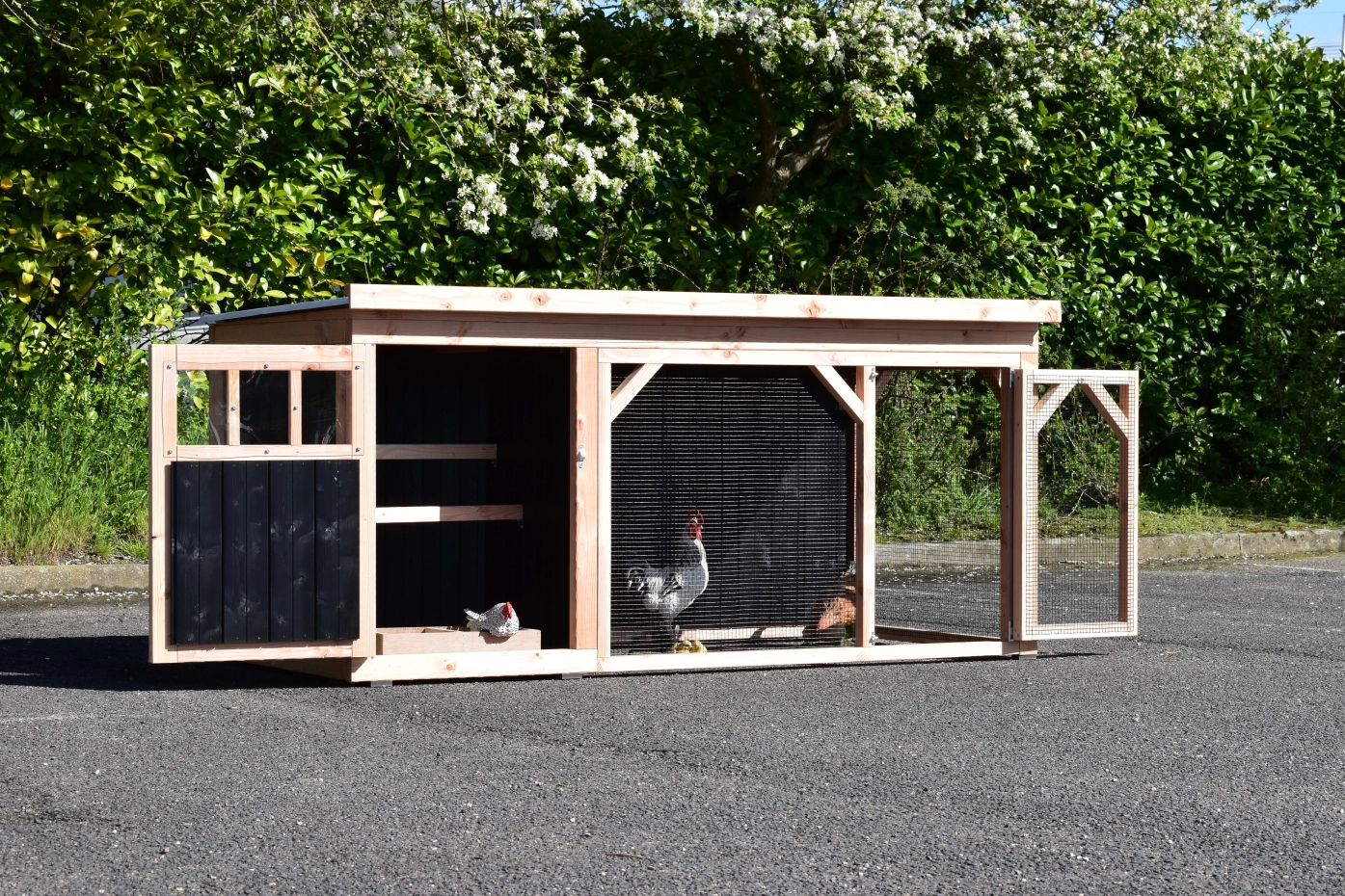 Kippenhok Belle 2 is een leuk en stevig kippenhok met overdekte ren. In het nachthok is een legbak, zitstokken en een douglashouten bodem voorzien. Omdat we het hok zelf maken en door het gebruik van goede kwaliteit materialen, is het erg onderhoudsvrij.