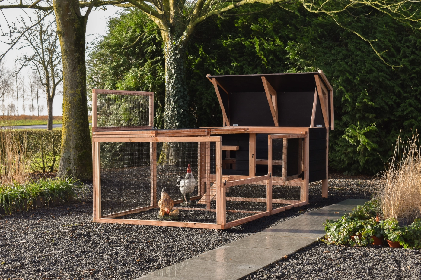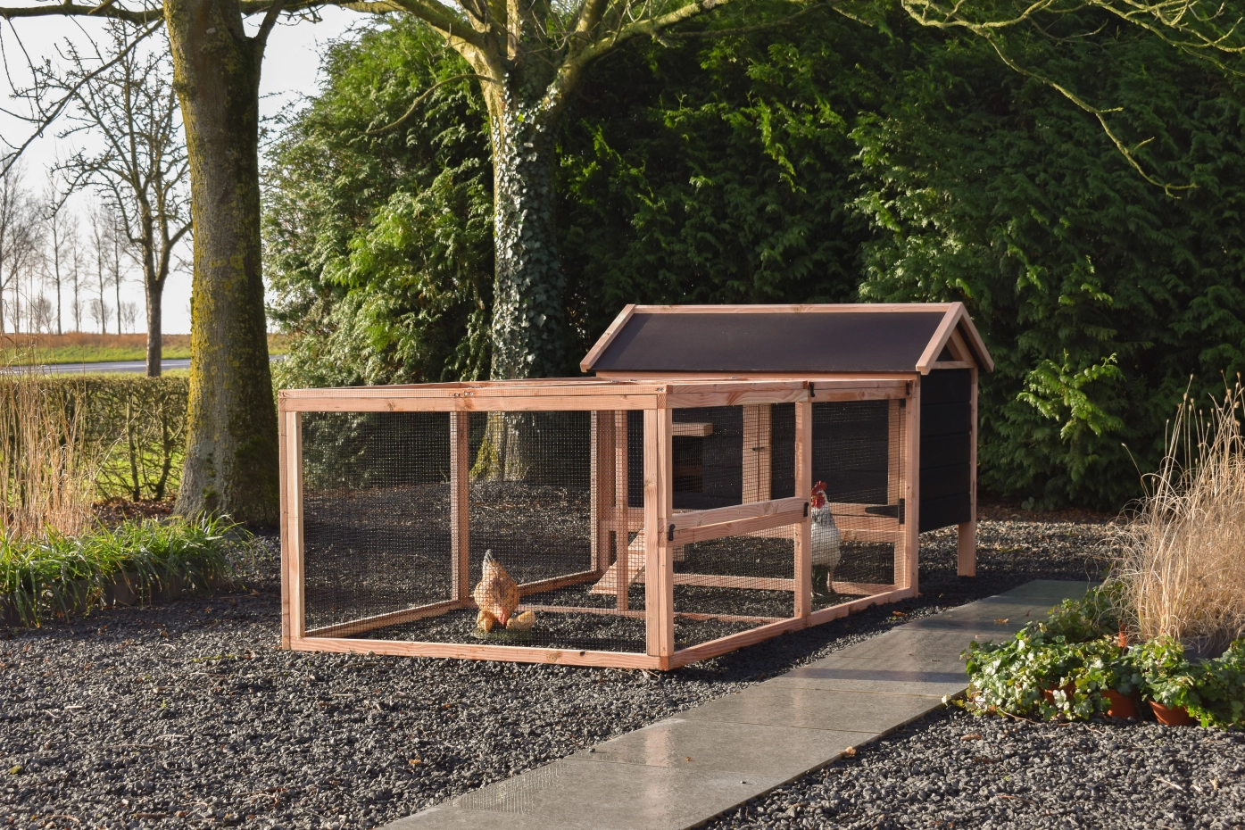 Dit lage model is gemakkelijk schoon te maken dankzij het opklapbare dak en het handige deurtje aan de voorkant. De combinatie douglas zwart geeft het hok een chique uitstraling.