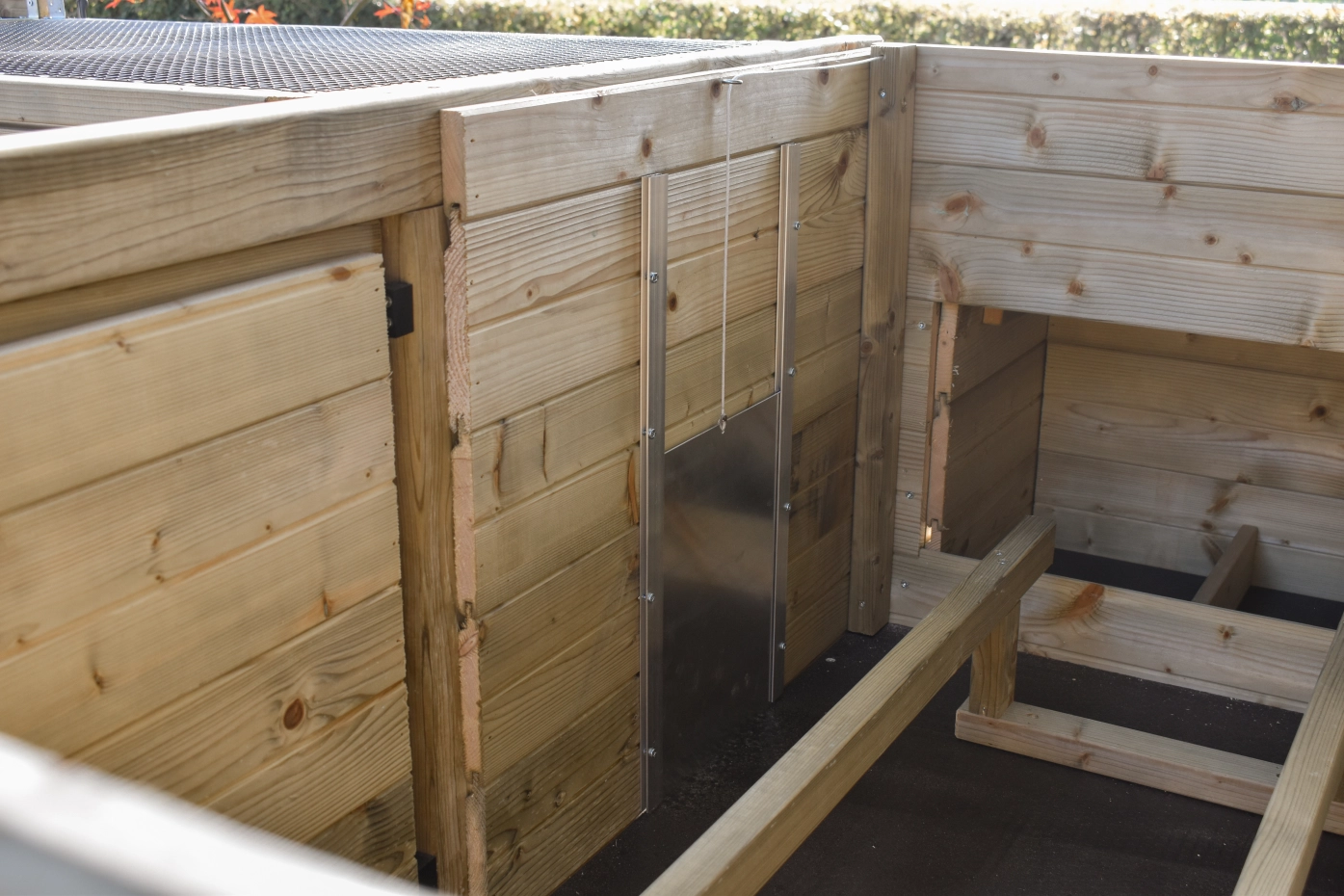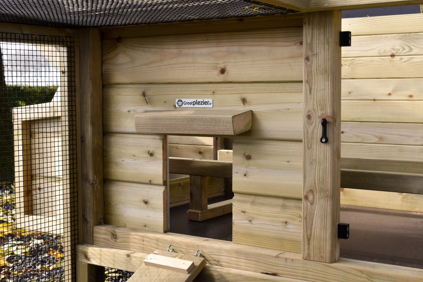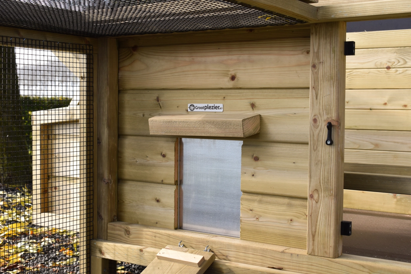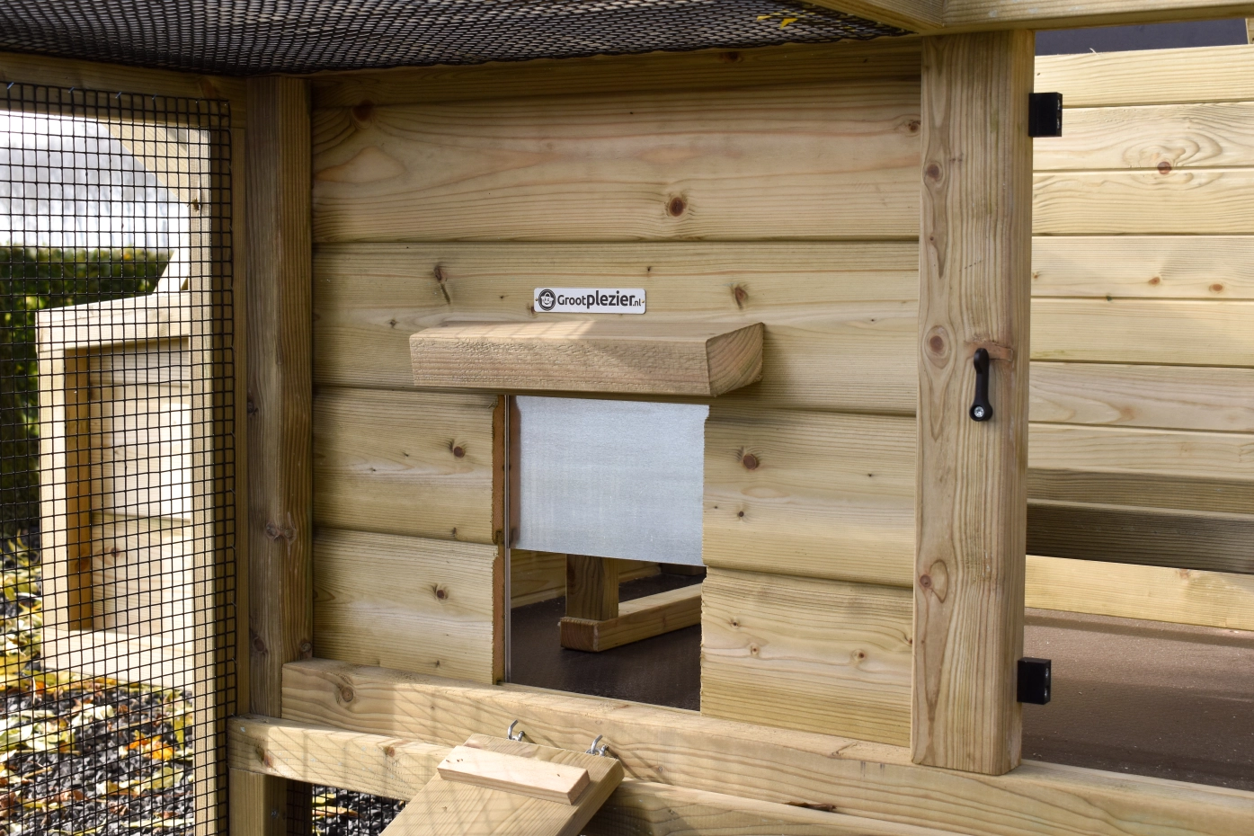 - Afsluitbaar nachthok: voorzien van aluminium schuifluik aan de binnenzijde