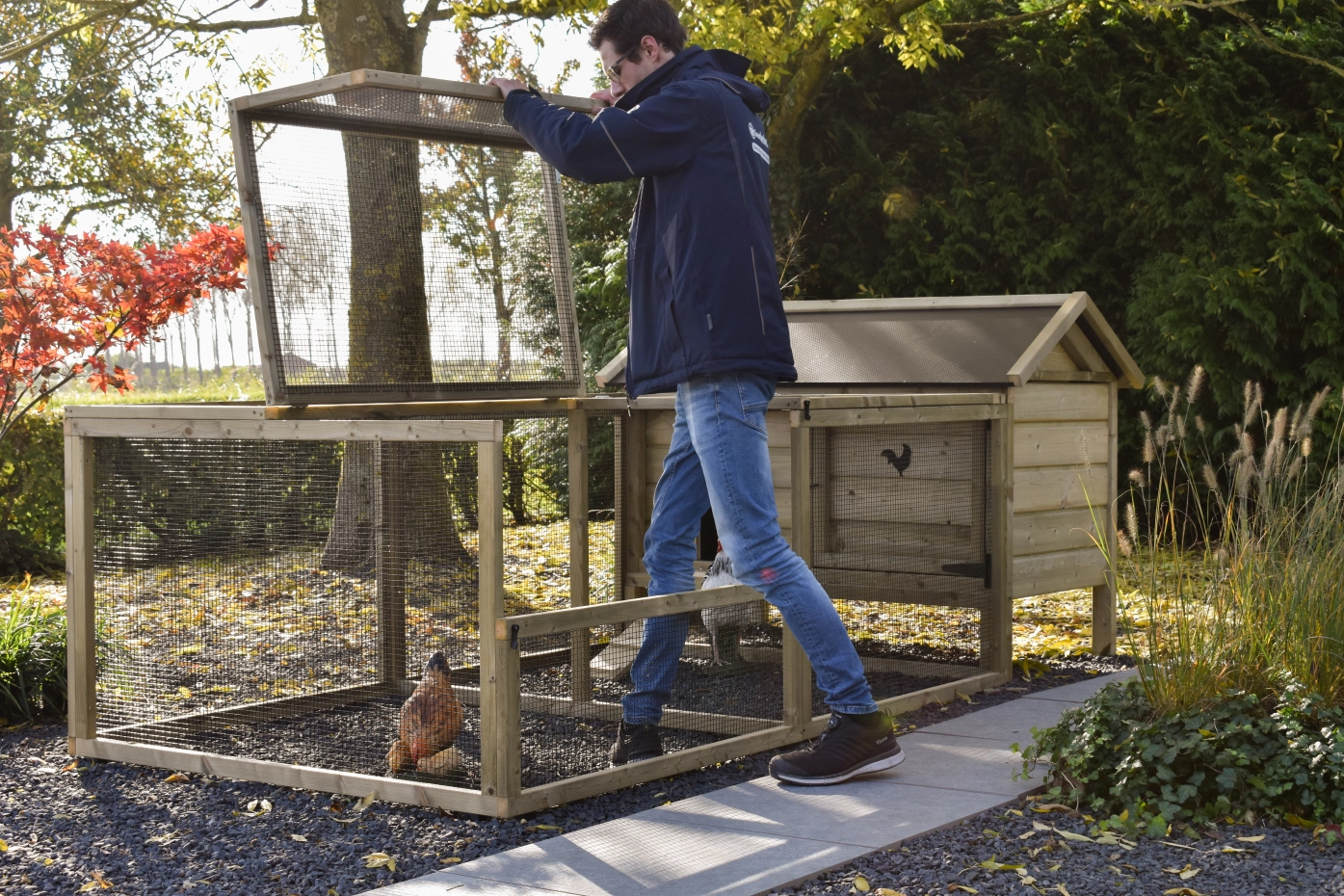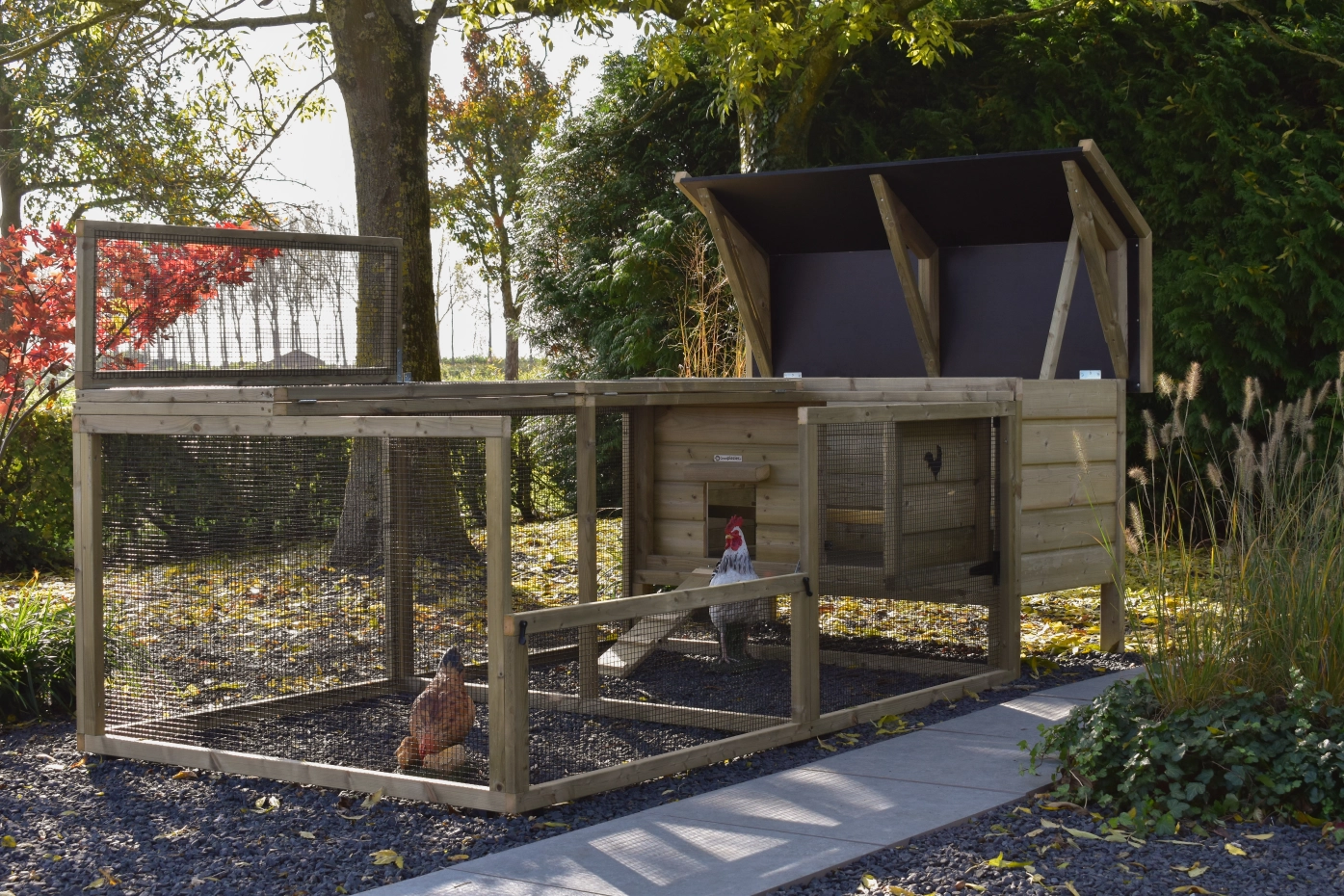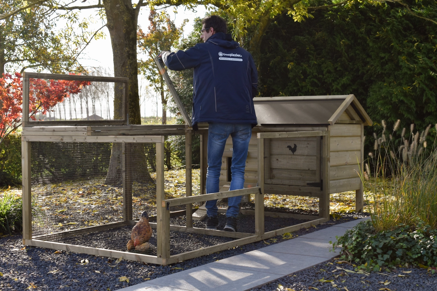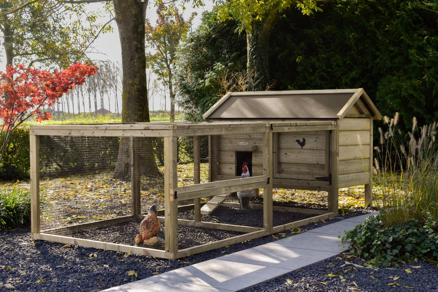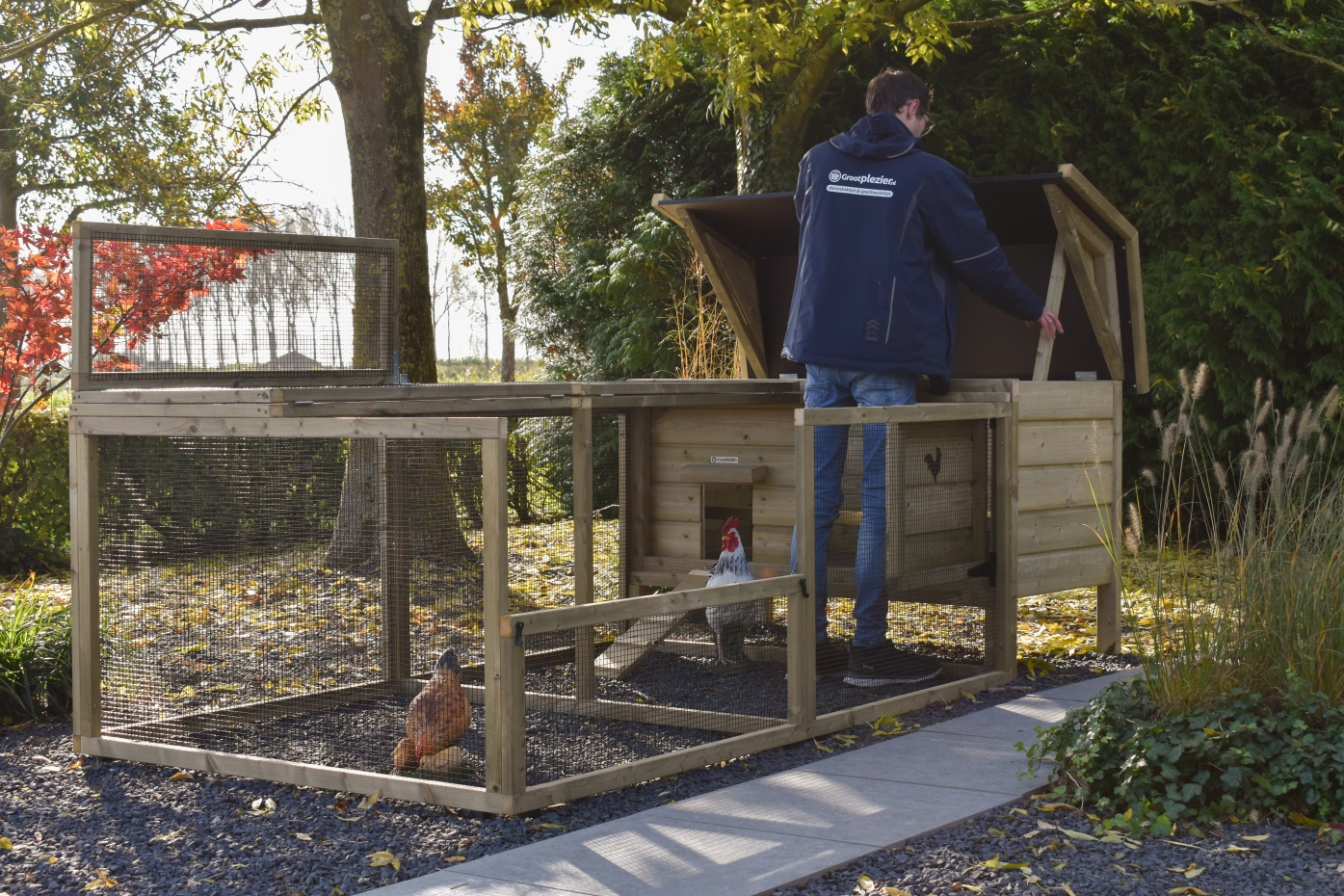 - Afsluitbaar nachthok: voorzien van aluminium schuifluik aan de binnenzijde