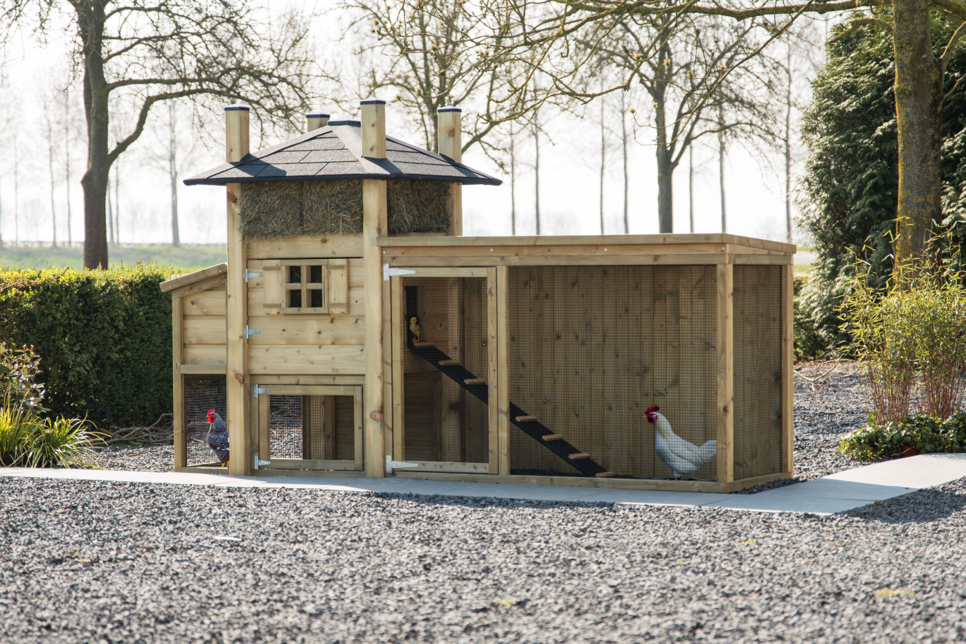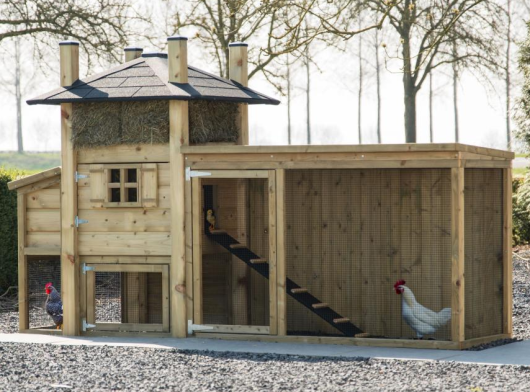 Kippenhok hooiberg Rosa met legnest en aanbouw ren. Schitterende combinatie met een ruime schuilplaats onder het hok/legnest en een ruime ren. Hier hebt u de optimale ruimte voor uw kippen. Het nachthok bied voor 3-5 kippen ruimte en is van alle gemakken voorzien. Door de ruime deur met kruisraam kunt u gemakkelijk schoon maken. Via het dakje van het legnest kunt u zonder te storen de eieren pakken. het hooi en het puntdak geven dit hok echt een landelijke uitstraling. de ren heeft een dichte achterkant zodat de kippen lekker beschut kunnen rusten.