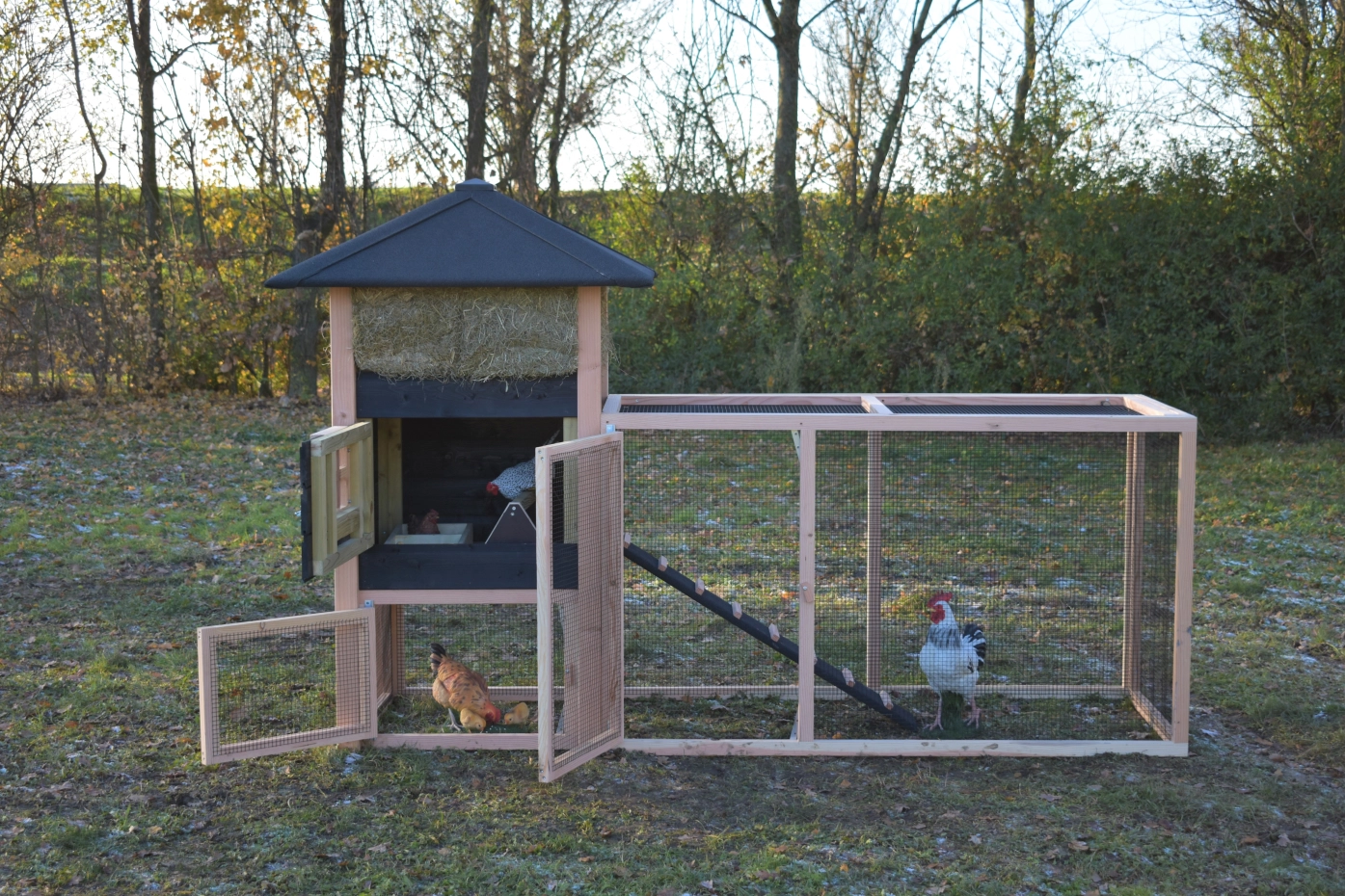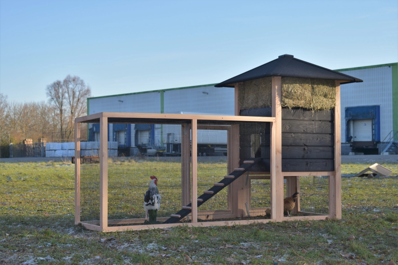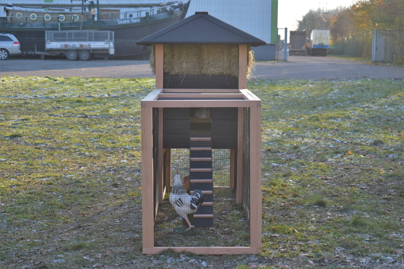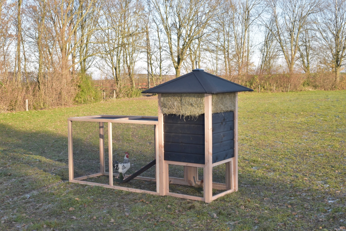 Kippenhok hooiberg Rosanne met aanbouwren. Wilt u voor een aannemelijke prijs een degelijk en duurzaam hok, dan is dit de juiste keuze. Het praktische en ruime nachthok en ren geven u echt veel gebruik plezier. De deuren zijn zo groot mogelijk gemaakt voor een ruime doorgang. Ren is voorzien van zwart gaas voor een optimaal zicht op uw kippen. Hoogwaardige kwaliteit hout wat jaren in weer en wind kan staan! Stevig dak met 5mm dik bitumen dakleer, dit kan een stootje hebben. Door de leuke details en mooie afwerking raden wij u dit hok zeer aan!