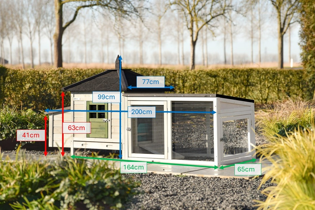 | Buitenwerkse afmetingen incl. dak en nestkast (BxDxH) | 200x77x99cm |