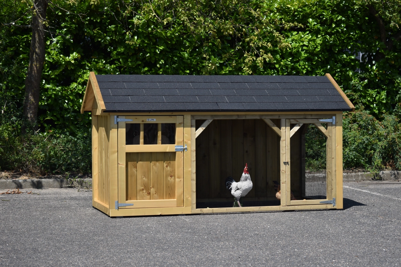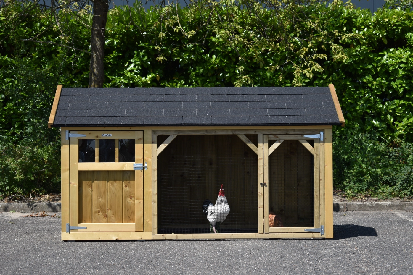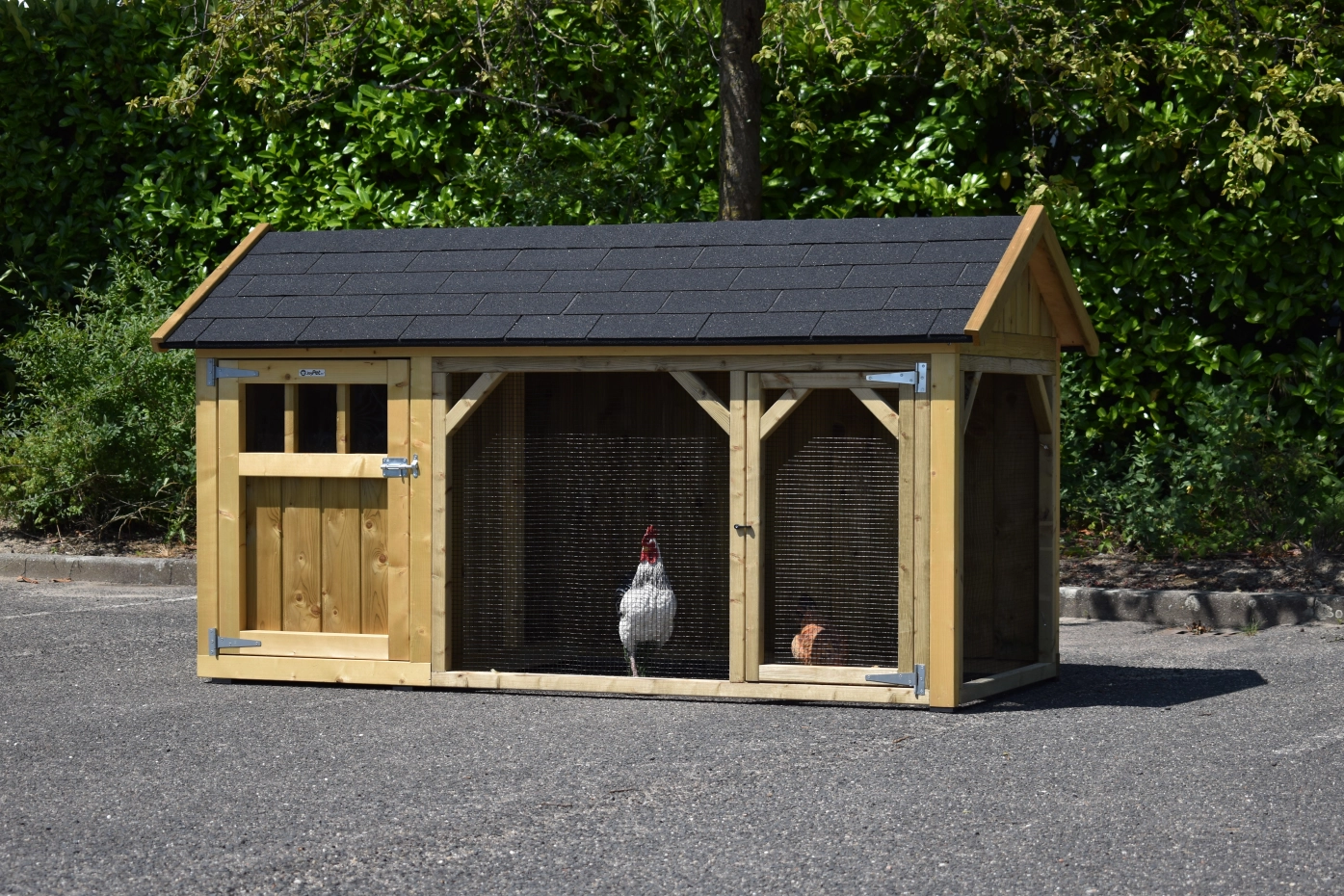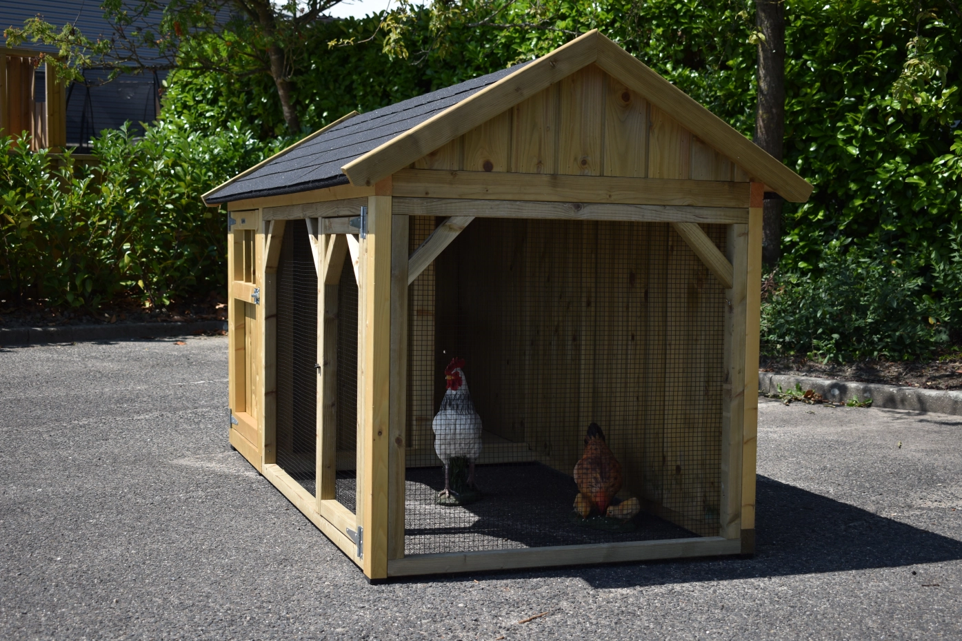 Kippenhok Belle 2 met puntdak. Een prachtig kippenhok met overdekte ren en chique uitstraling door het lange puntdak. De ren is voorzien van gaas aan 2 kanten. De achterkant is van massief hout zodat de kippen goed beschut zitten. Het nachthok is voorzien van een dubbele legbak, zitstokken en een geïmpregneerd houten bodem. Omdat we het hok zelf maken en door het gebruik van goede kwaliteit materialen, is het erg onderhoudsvrij.