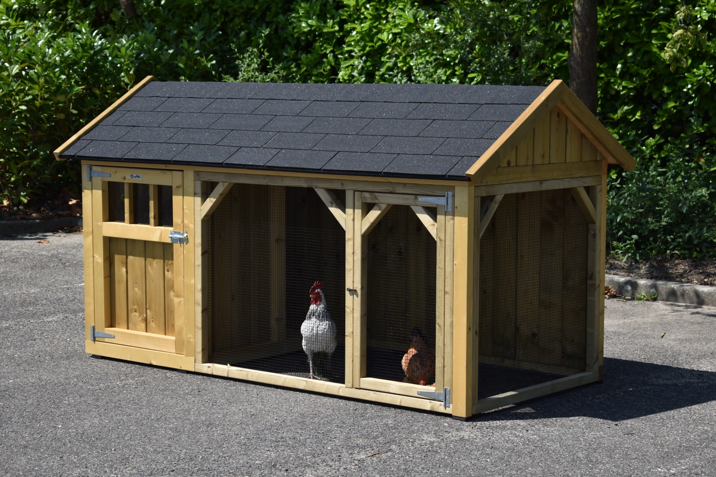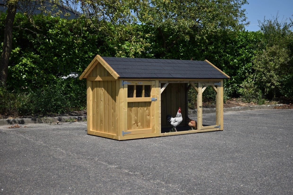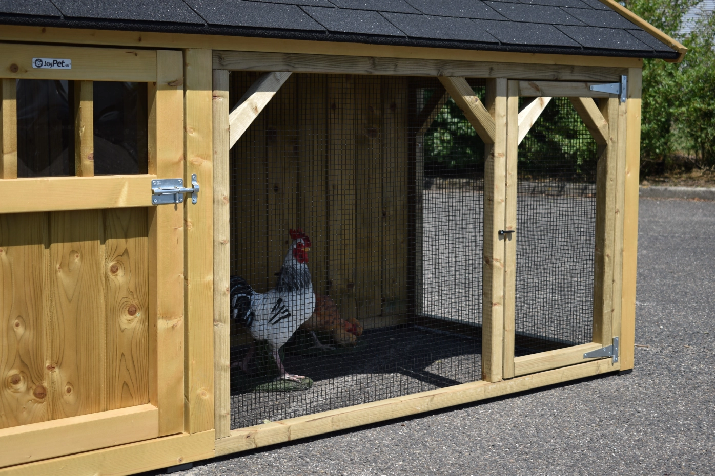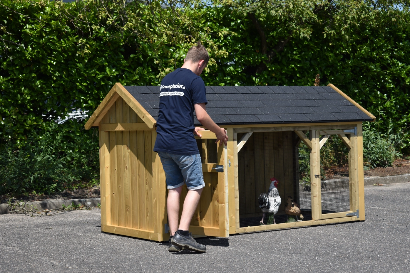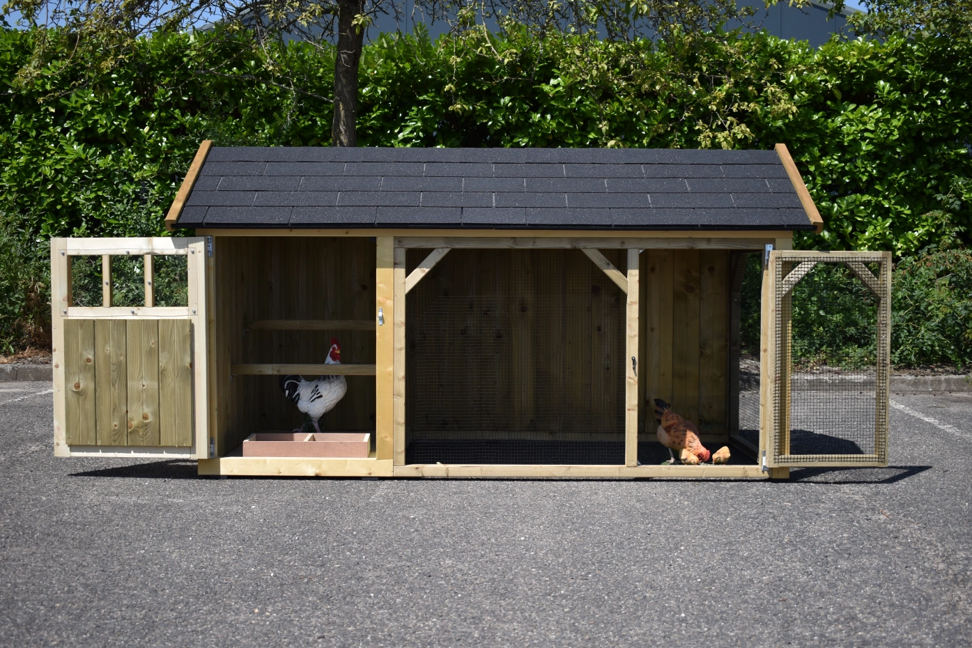 Kippenhok Belle 2 met puntdak. Een prachtig kippenhok met overdekte ren en chique uitstraling door het lange puntdak. De ren is voorzien van gaas aan 2 kanten. De achterkant is van massief hout zodat de kippen goed beschut zitten. Het nachthok is voorzien van een dubbele legbak, zitstokken en een geïmpregneerd houten bodem. Omdat we het hok zelf maken en door het gebruik van goede kwaliteit materialen, is het erg onderhoudsvrij.