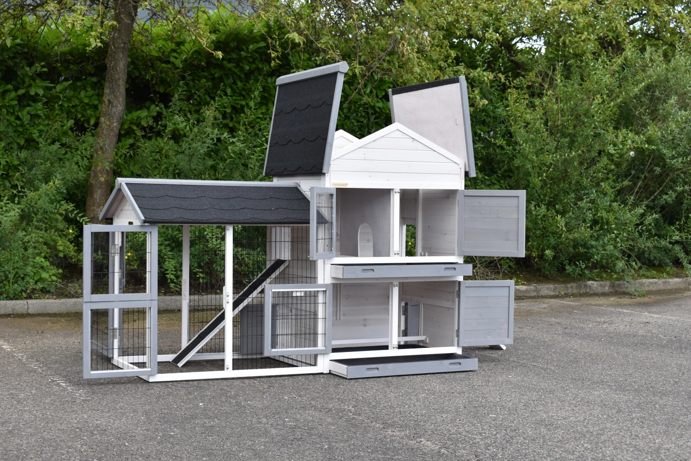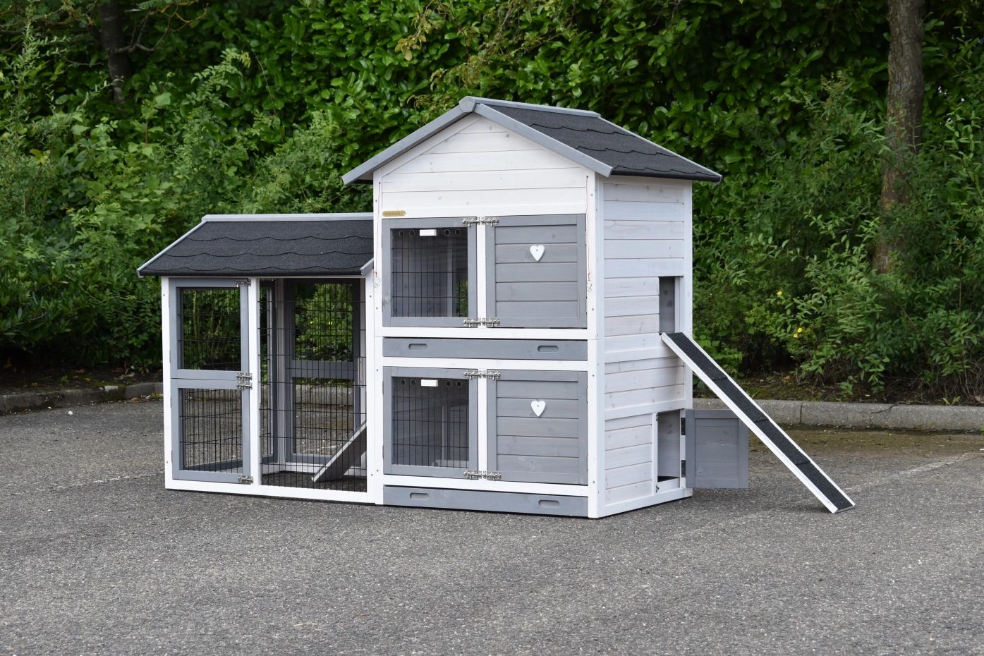 - Dit dierenverblijf is tegelijk als kippenhok en konijnenhok te gebruiken
