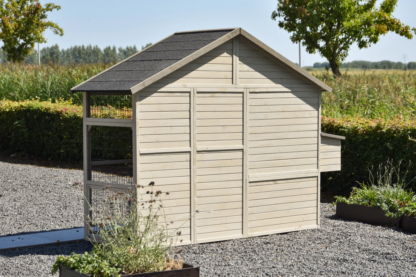 - Wanneer het hok niet op een beschutte plaats staat, dan adviseren wij om het te verankeren