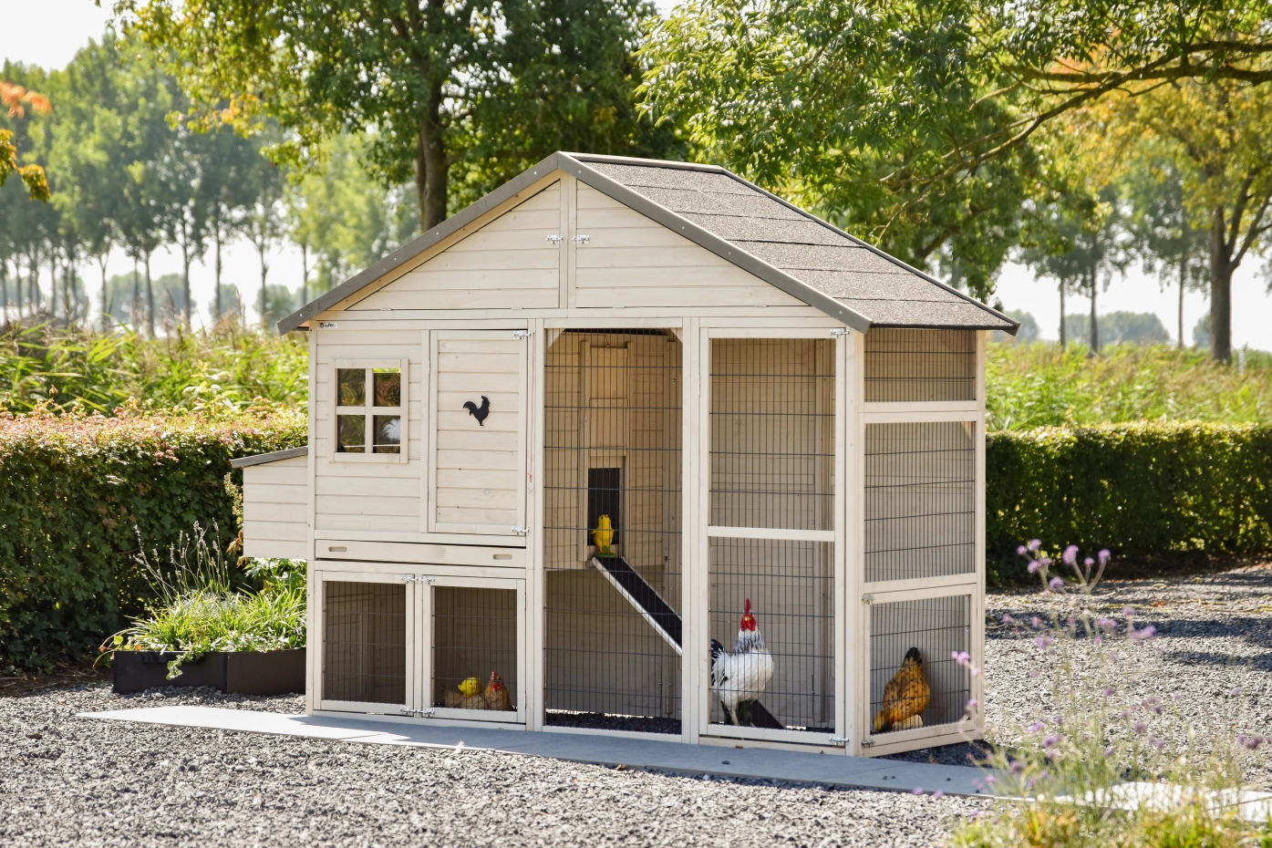 Groot kippenhok kopen? De Holiday Large met legnest is een groot hok, geschikt voor ca. 6-10 kippen. Het is een bijzonder mooi en handig kippenhok. Het bestaat uit een nachthok, bergzolder, legnest en een kippenren. Het nachthok is voorzien van 2 zitstokken voor de kippen. Overal waar een deur mogelijk is, zit ook een deur: superhandig om schoon te maken. Zeker in combinatie met de handige schuiflade. Kippenhok Holiday Large is eenvoudig uit te breiden met een aanbouwren.