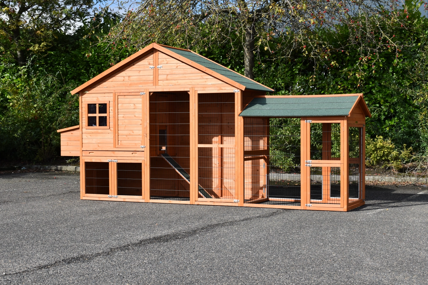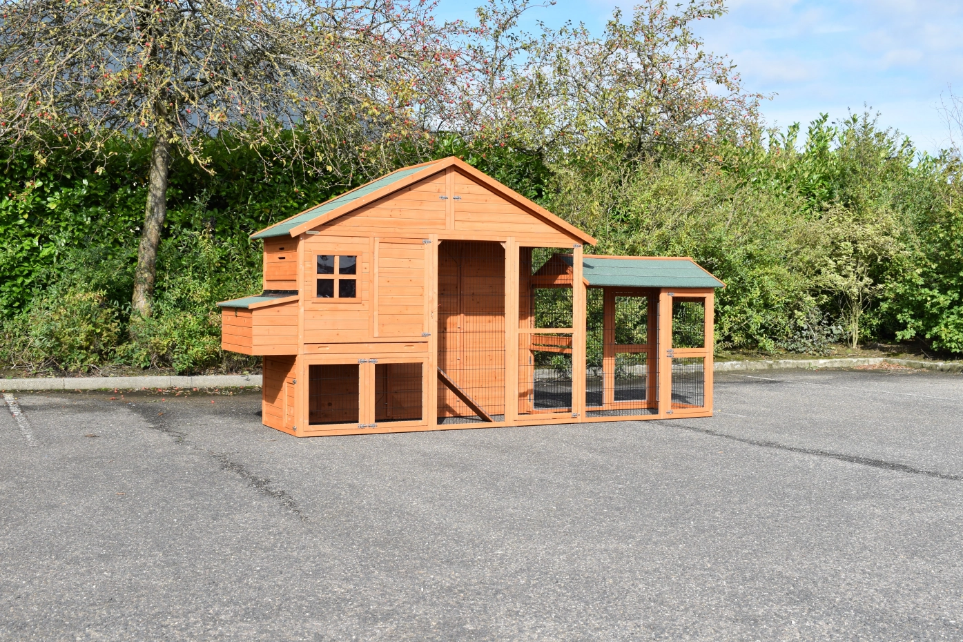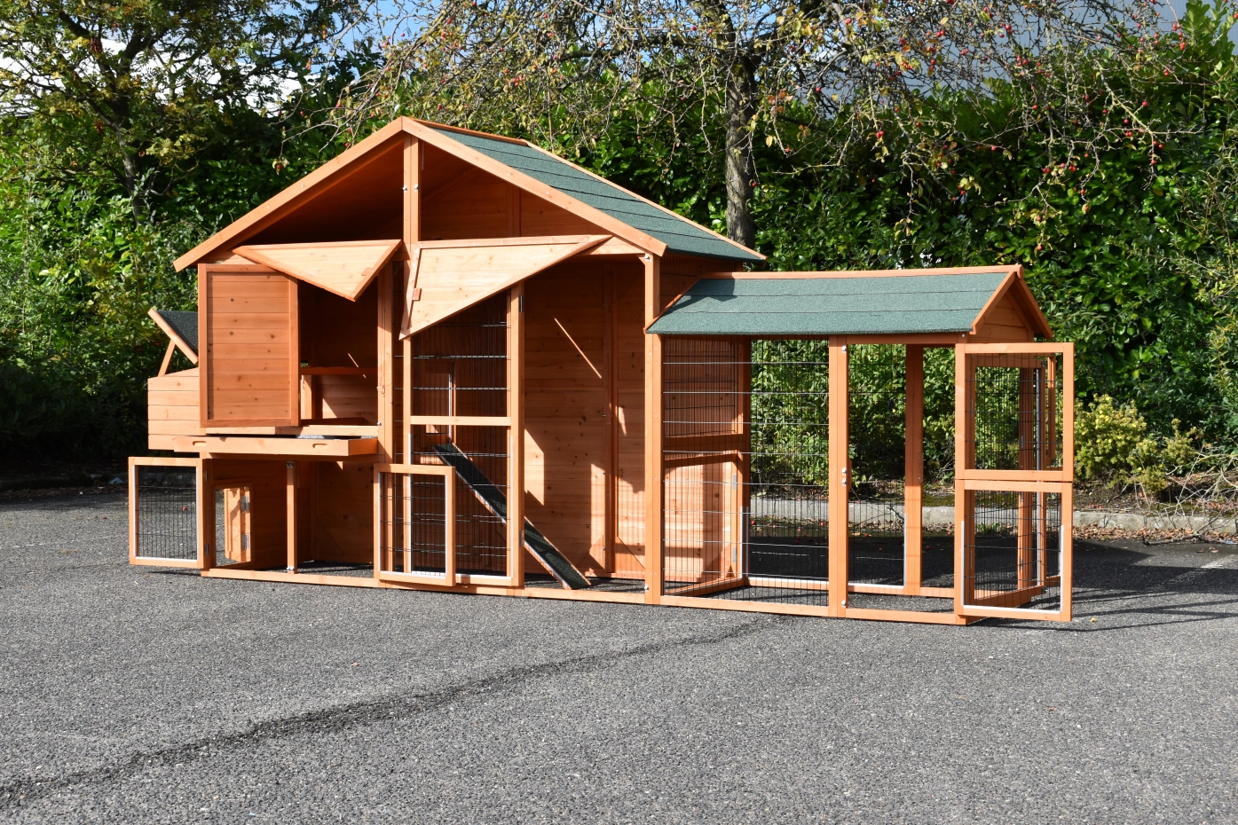 Kippenhok Holiday Large met extra uitloopren. Kippenhok Holiday Large met extra uitloopren is een zeer praktisch, mooi en ruim kippenhok van uitgekiende topkwaliteit. Ook heeft dit kippenhok een nachthok en zeer royale ren. Kippenhok Holiday Large met extra ren is geschikt voor het huisvesten van ongeveer 6 tot 8 kippen. De afmetingen van kippenhok Holiday Large met aanbouwren zijn maarliefst: 392x100x195cm. De afmetingen van kippenhokken worden altijd buitenwerks vermeld, incl. overstekende dakpanelen.