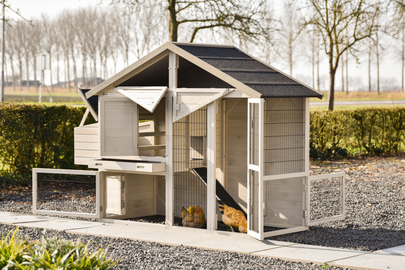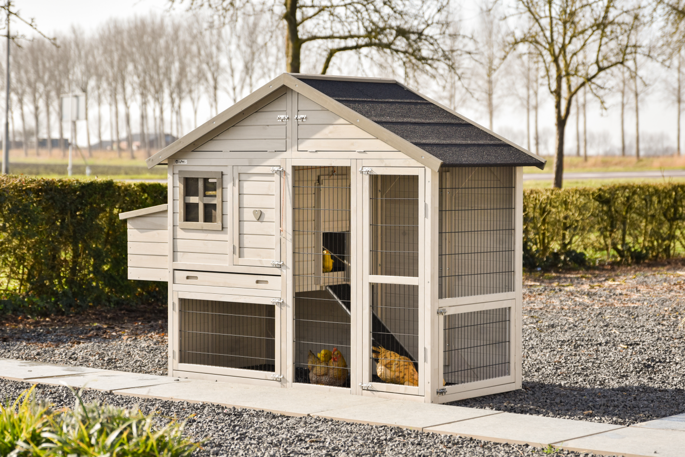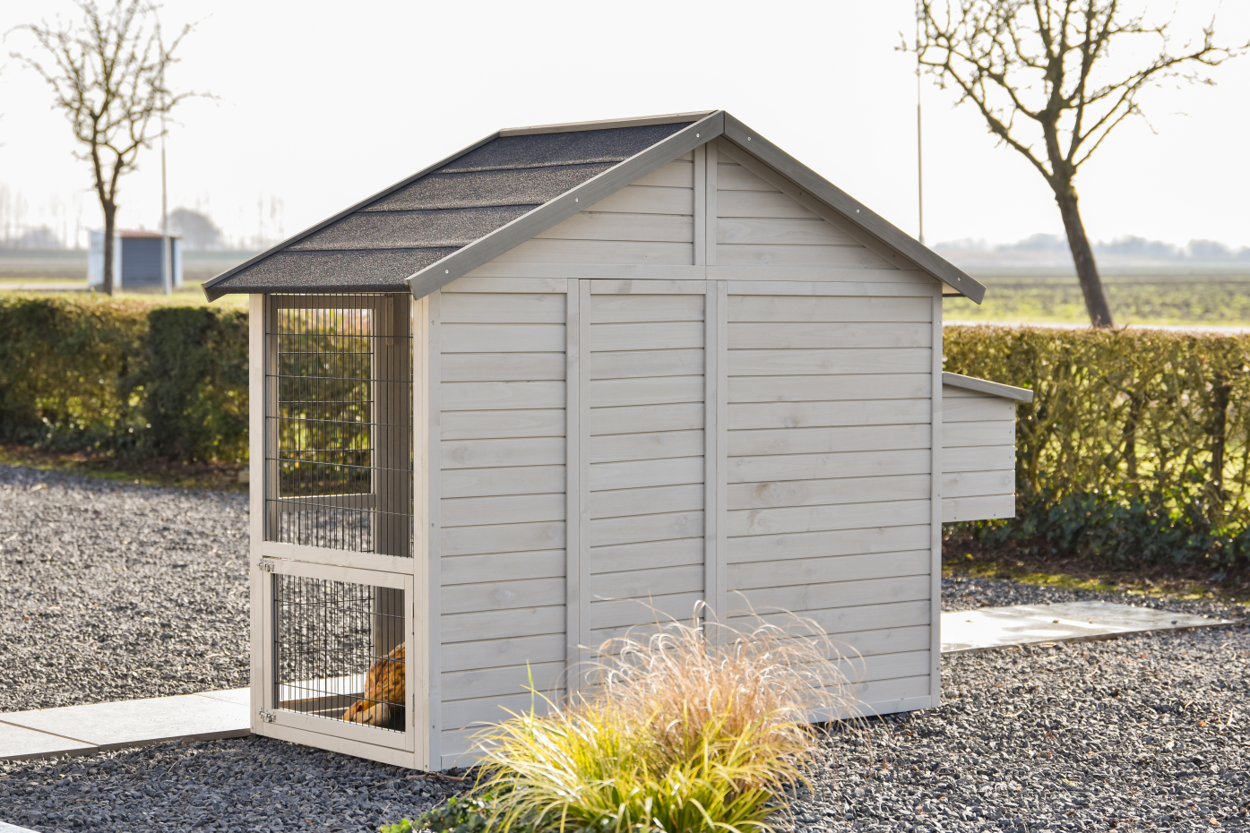 Kippenhok Holiday medium light-grey is een ruim en overzichtelijk verblijf met meerdere toegangsdeuren, waardoor dagelijkse verzorging en schoonmaak eenvoudig blijven; dit middelgrote model uit de Holiday-serie biedt kippen een comfortabel nachthok met zitstokken, een praktische opbergzolder voor voer of benodigdheden en een ruim legnest waar zij in alle rust hun eieren kunnen leggen.
