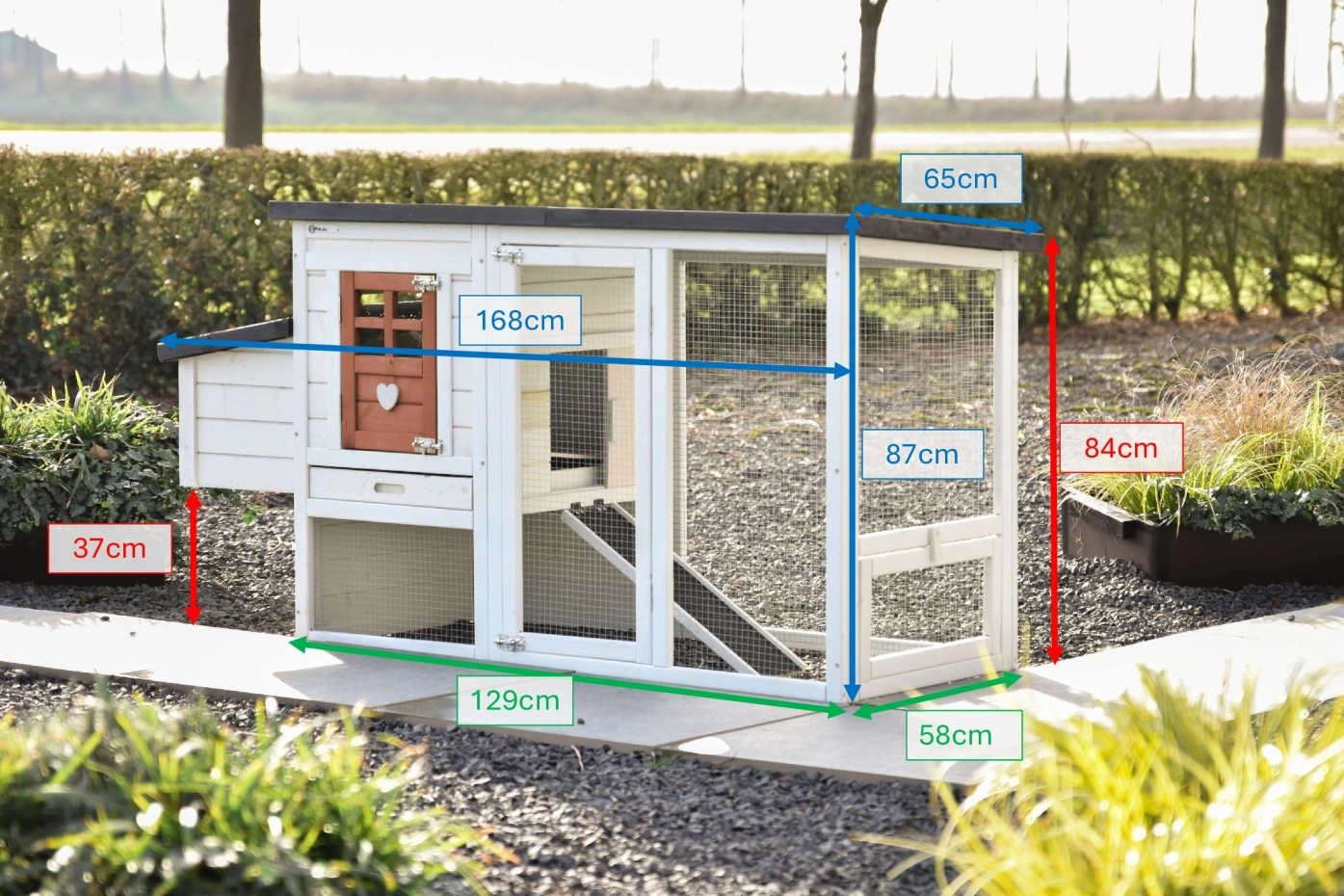 | Buitenwerkse afmetingen incl. dak en nestkast (BxDxH) | 168x65x87cm |