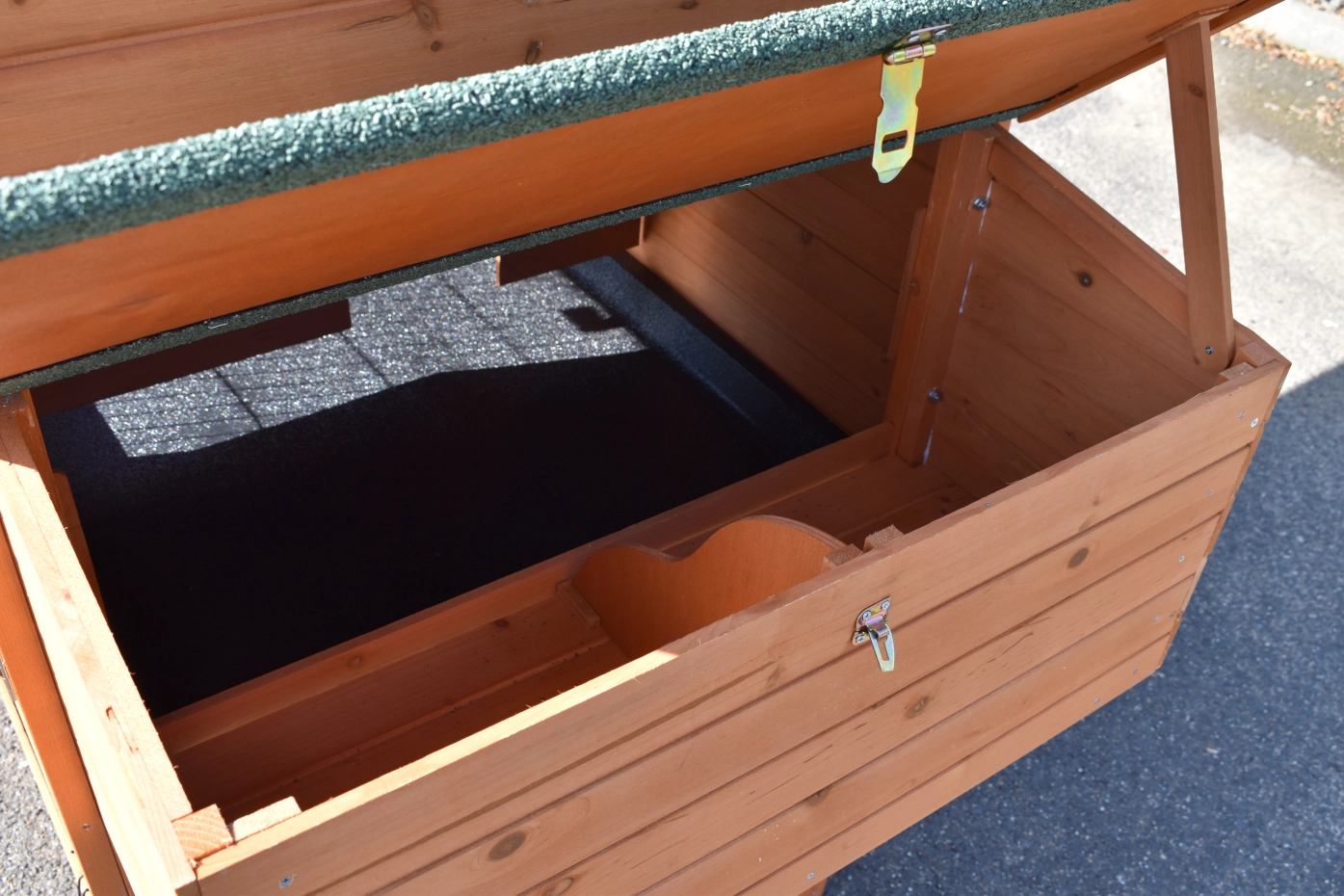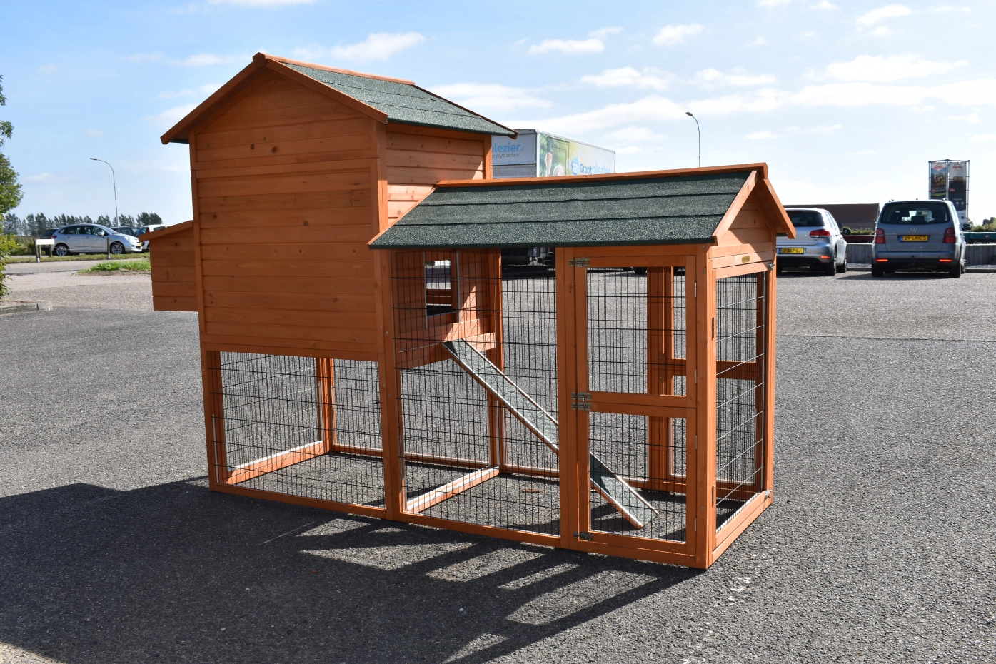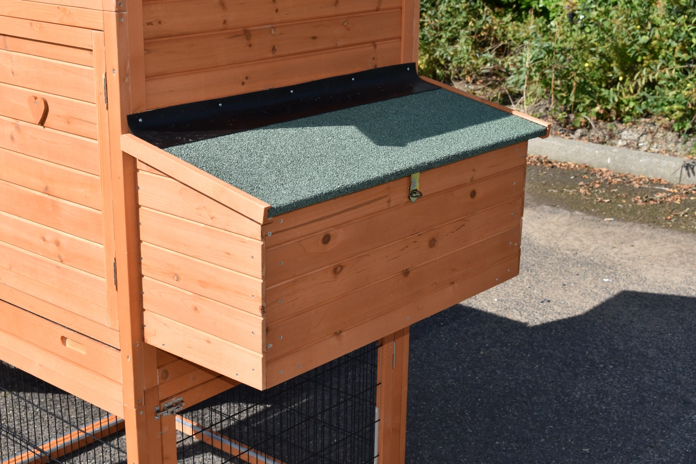• Het hok heeft een dak met dakleer