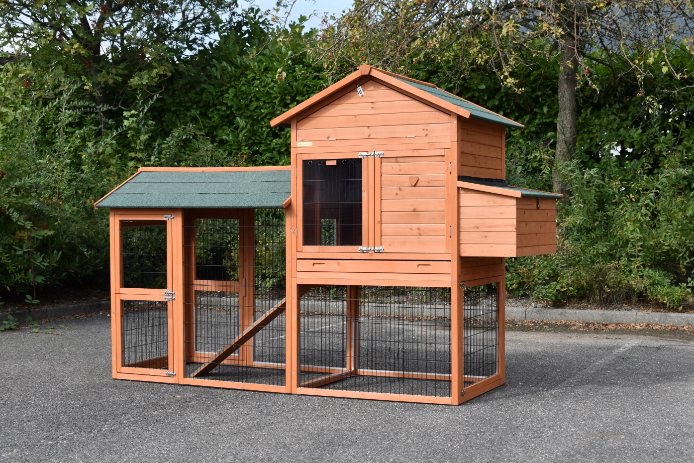 Kippenhok Prestige Large met linkerren en legnest is een geweldig kippenhok voor uw kippen. Dit grote kippenhok is tot in detail uitstekend afgewerkt met diverse ruime deuren, royaal nachthok met zitstokken, handig legnest en ruime ren. Voor de optimale bescherming staat het kippenhok op rubber voetjes. Dit maakt kippenhok Prestige Large zeer praktisch in gebruik.