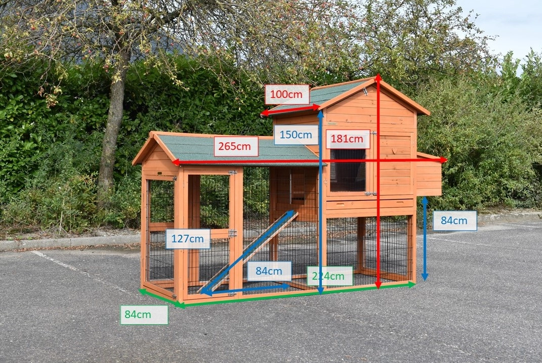 Buitenwerkse afmetingen incl. dak en nestkast (BxDxH) 265x100x181cm