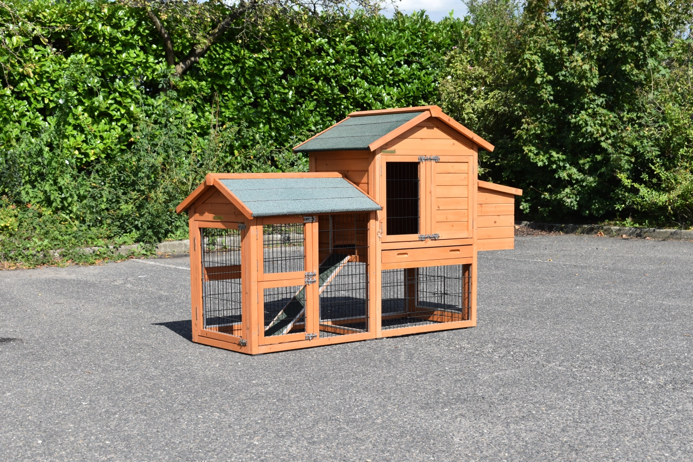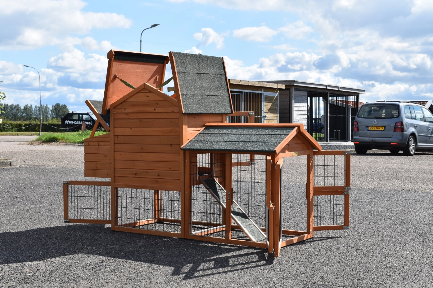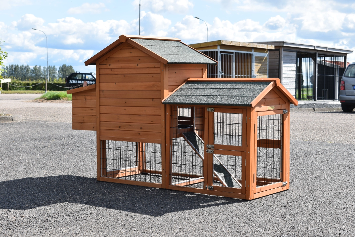Kippenhok Prestige Small met ren en legnest. Kippenhok Prestige Small met ren en legnest is gemakkelijk schoon te houden, vanwege de ruime deuren en praktische uitschuifbare kunststof mestlade in dit konijnenhok. Ook is dit hok voorzien van een zitstok. Kippenhok Prestige Small met ren en legnest is al 1x gebeitst. Het verdient aanbeveling om het kippenhok nogmaals te beitsen, voordat u het hok in gebruik neemt, zodat de duurzaamheid van het kippenhok optimaal blijft tijdens weersinvloeden.