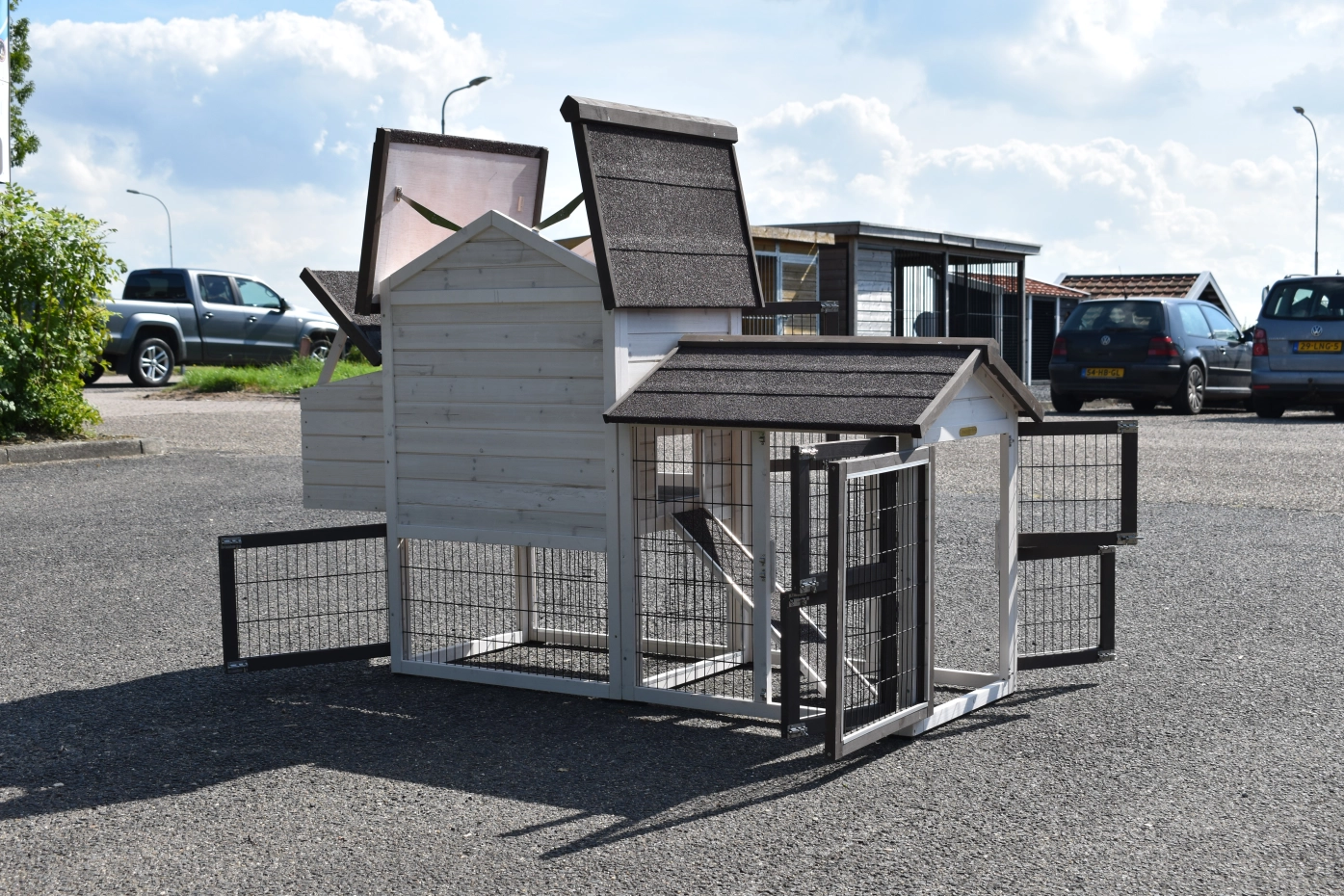 Kippenhok Prestige Small met ren en legnest. Kippenhok Prestige Small met ren en legnest is gemakkelijk schoon te houden, vanwege de ruime deuren en praktische uitschuifbare kunststof mestlade in dit kippenhok. Ook is dit hok voorzien van een zitstok. Kippenhok Prestige Small met ren en legnest is 1x gebeitst al verdient het de aanbeveling om uw kippenhok nogmaals te beitsen voordat u het hok in gebruik neemt, zodat de duurzaamheid van het kippenhok optimaal blijft tijdens weersinvloeden.