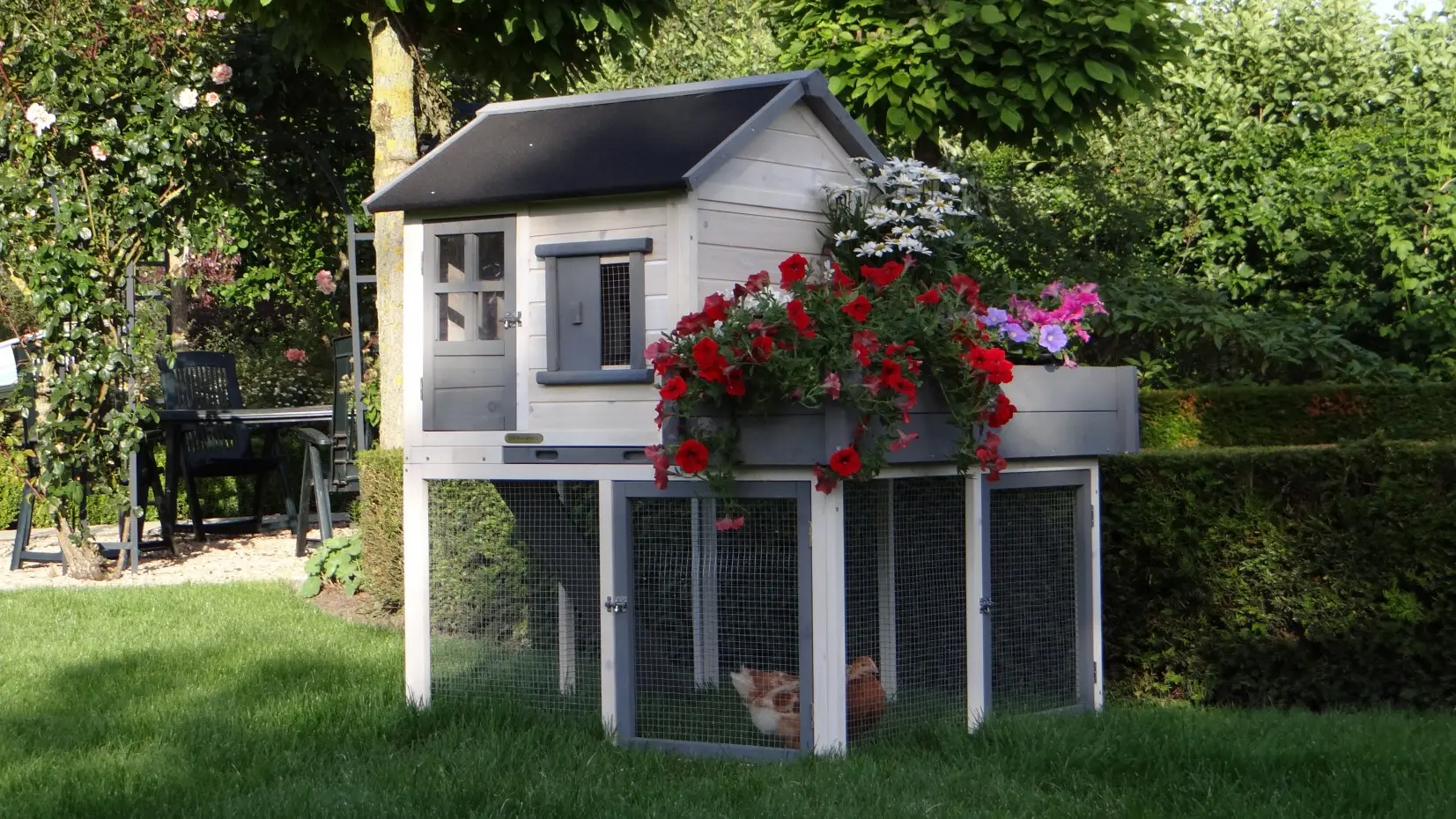 Kippenhok Sunshine is een prachtig kippenhok met een leuke bloembak. Verder heeft dit kippenhok een nachthok, kippenren, zitstok, uitschuifbare mestlade in het nachthok en legnest. Geschikt voor het huisvesten van 1 tot 4 kleine kippen. De ren heeft een hoogte van 58cm.