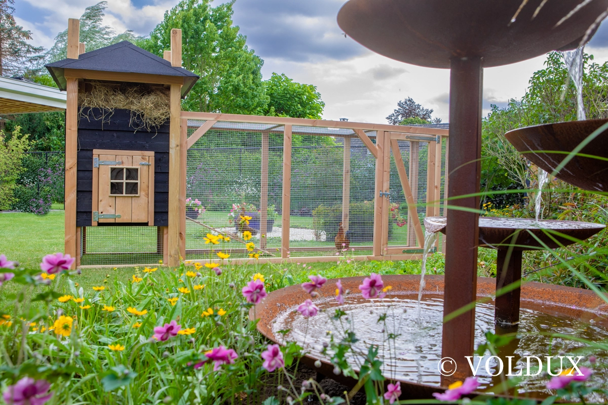Jouw eigen hooiberg in de tuin of in de dieren ren, wie wil dat nu niet? Deze prachtige verschijning is niet alleen een lust voor het oog, hij zorgt ook voor een goede en praktische huisvesting voor jouw kippen. De kippenhooiberg welke is opgebouwd met een stevig houten douglas frame is voorzien van een comfortabel nachthok met een afmeting van 97x97cm. Het nachthok welke afgewerkt is met zwarte potdekseldelen beschikt daarbij over een grote deur aan de voorzijde. Deze deur welke af te sluiten is met een schuifslot is tevens voorzien van een plexiglas raam. Dit zorgt niet alleen voor licht in het verblijf, hij maakt het ook mogelijk de kippen te zien zonder het verblijf te openen. In het nachthok bevinden zich een zitstok en legnest voor de kippen. Door middel van de trap welke via het nachthok te bereiken is kunnen de kippen zelf toegang nemen tot de vaste en volledig gesloten kippenren. Deze ren welke een fijne werkhoogte heeft loopt volledig door tot onder het nachtverblijf waarvoor deze een totale oppervlakte biedt van 397x97cm. Hierdoor ontstaat meer ruimte voor de kippen om scharrelen. De praktische deur in de ren verleend hiernaast goede toegang en geeft je eveneens de mogelijk om tijd door te brengen met jouw kippen op een veilige manier in het verblijf.