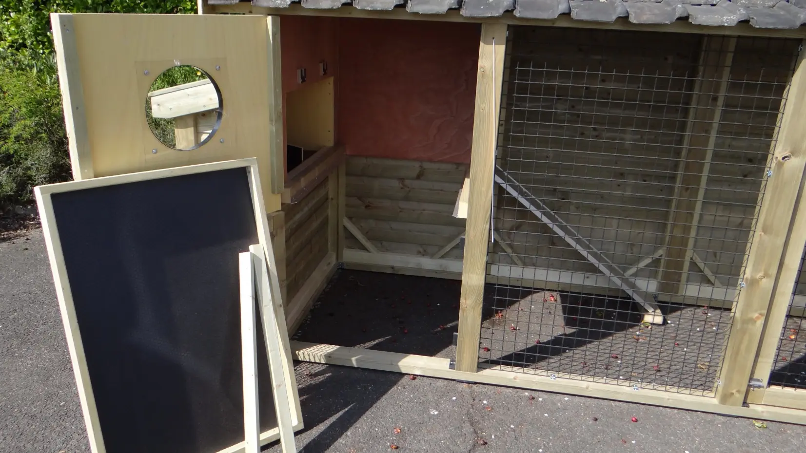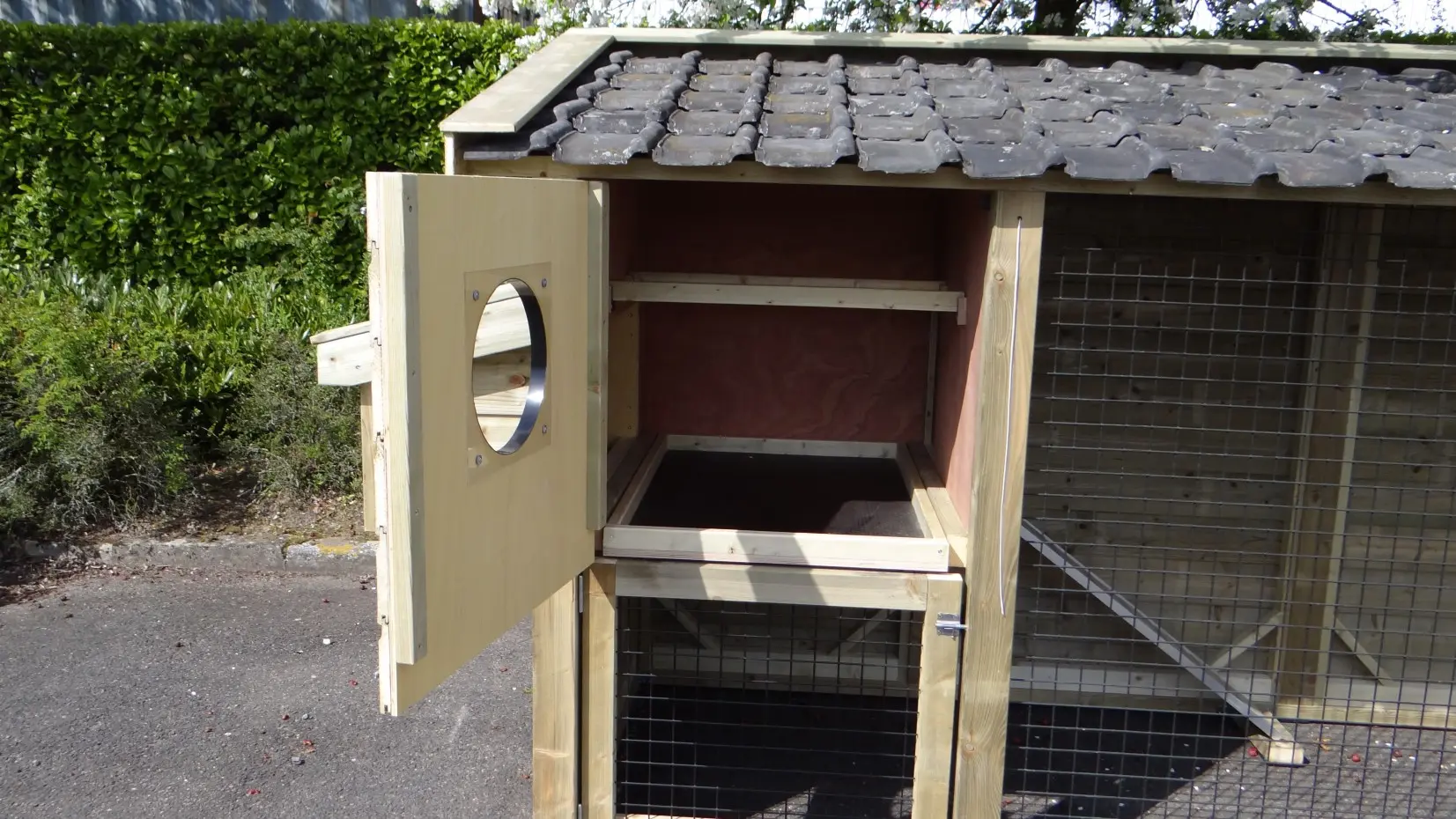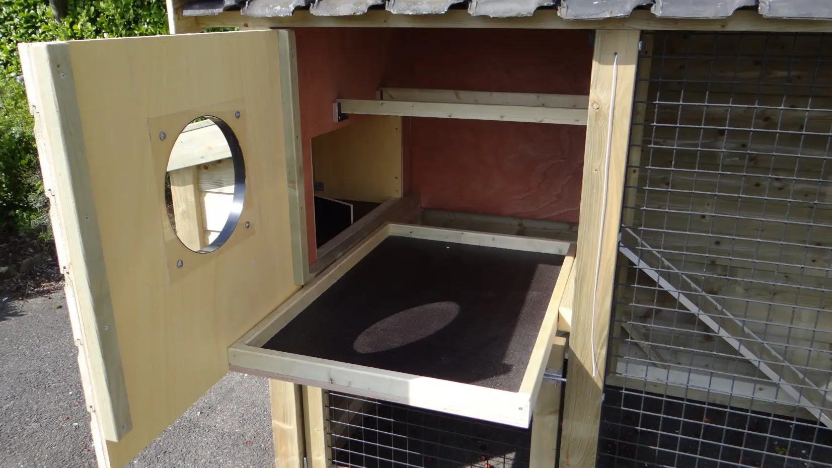 • De binnenkant van het nachthok is betimmerd met hardhout multiplex
