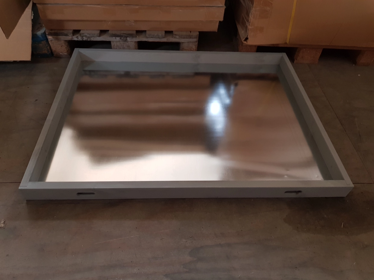 Schuiflade voor konijnenhok of kippenhok. De lade is een houten frame met daarin metalen plaat. Afmeting lade: 115x88x7cm.