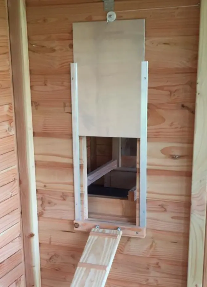 Aluminium luik met 2 geleiders om voor de opening van het kippenhok te plaatsen.