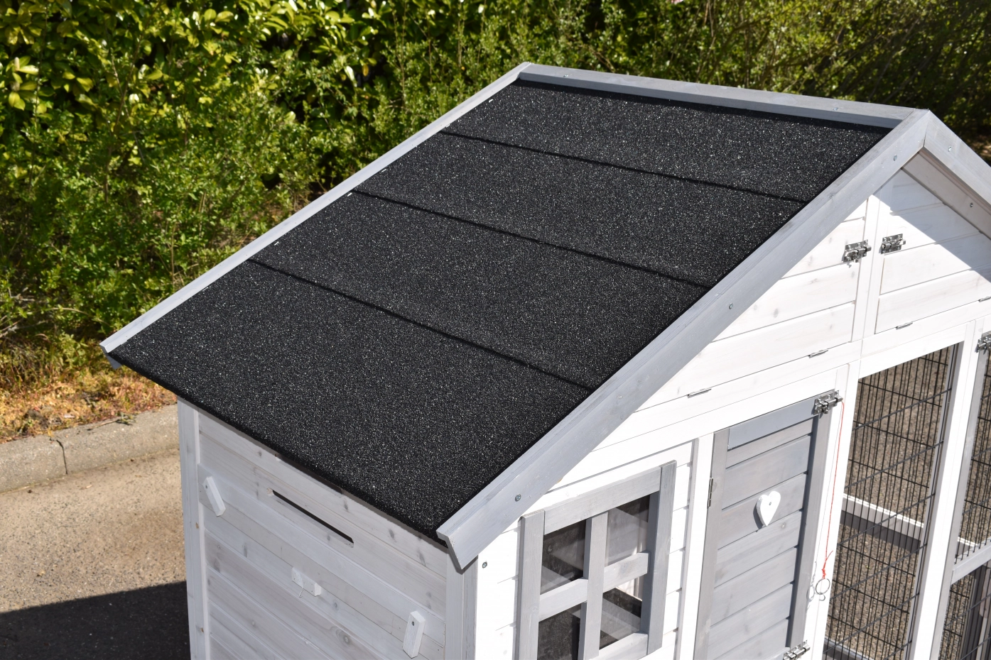 - Het hok heeft een dak met dakleer