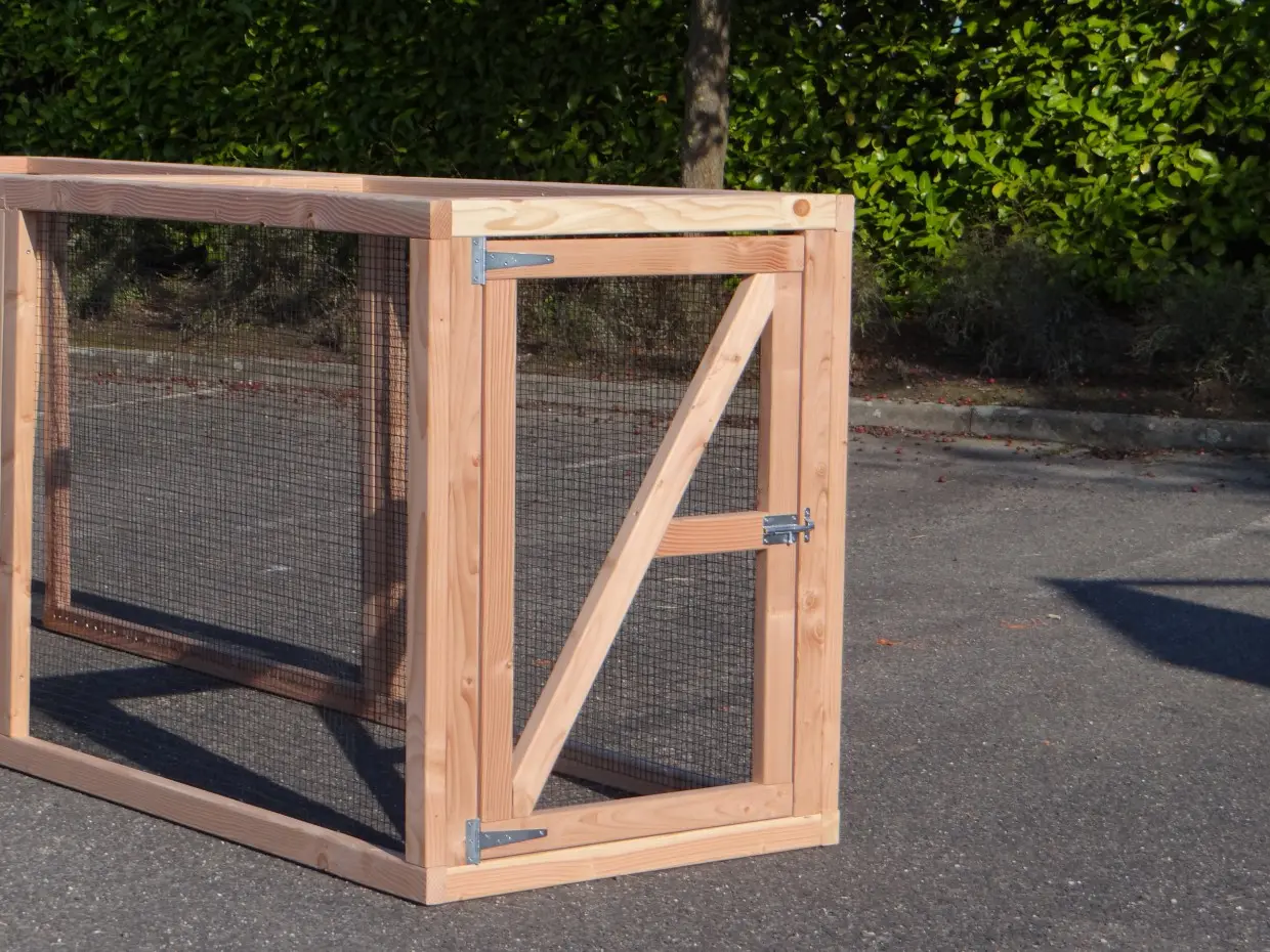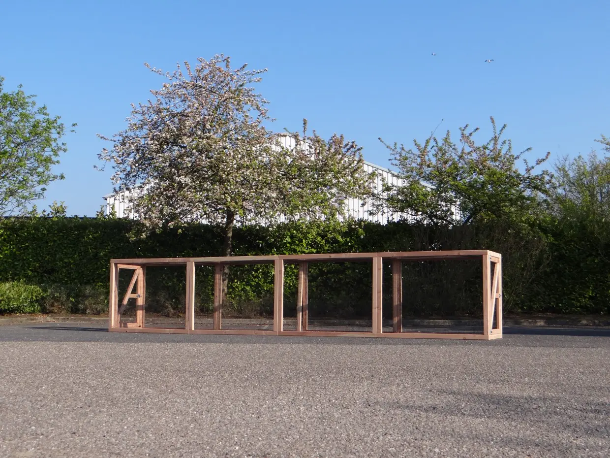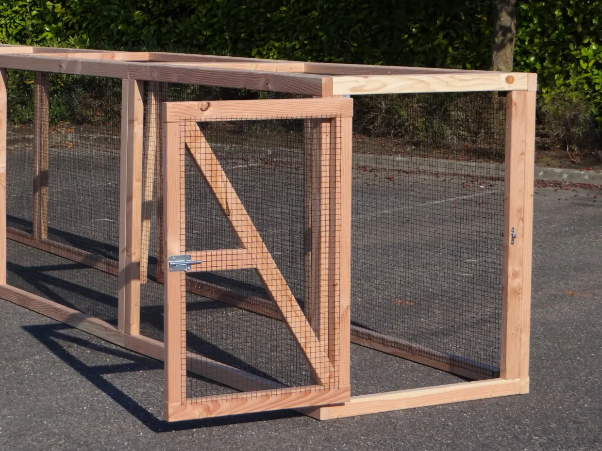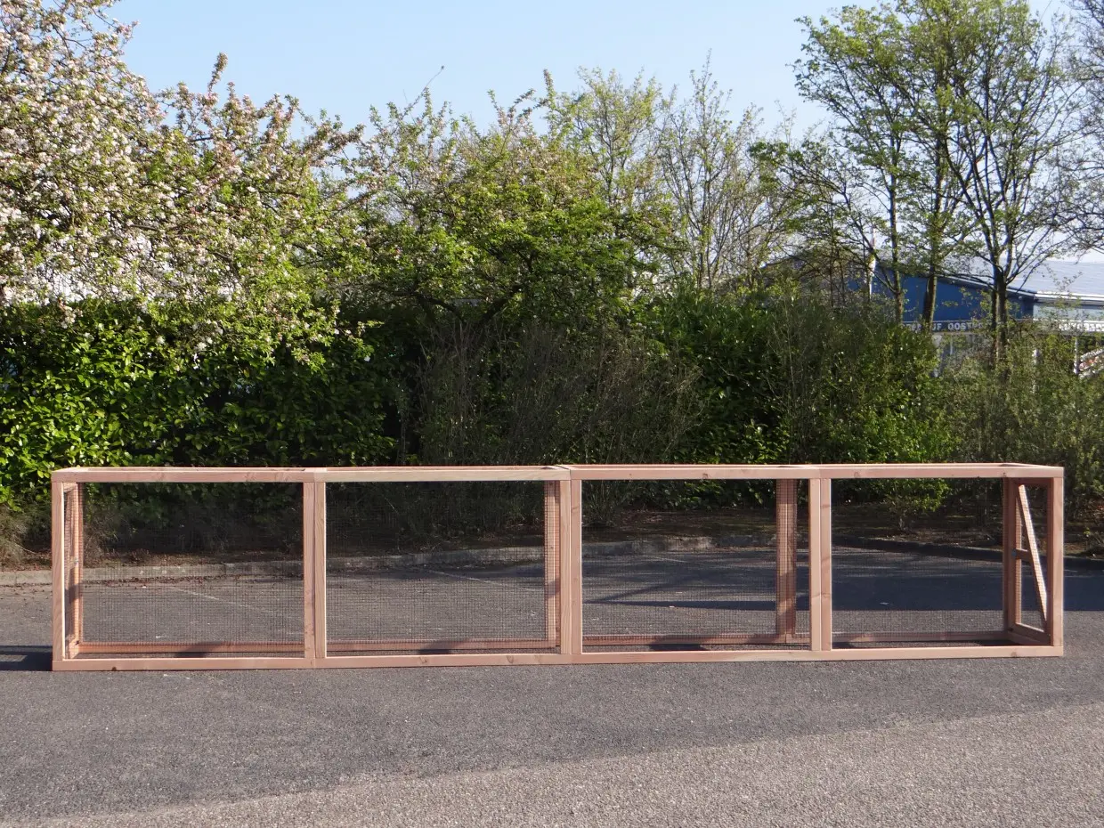 Deze grote dierenren is ideaal om kippen, konijnen of katten in te houden. De ren is gemaakt van douglashouten frames met daarin zwart gaas. De ren heeft een oppervlakte van ca. 7m². Deze dierenren is prima geschikt om te combineren met konijnen-/kippenhok Hooiberg Hielke.